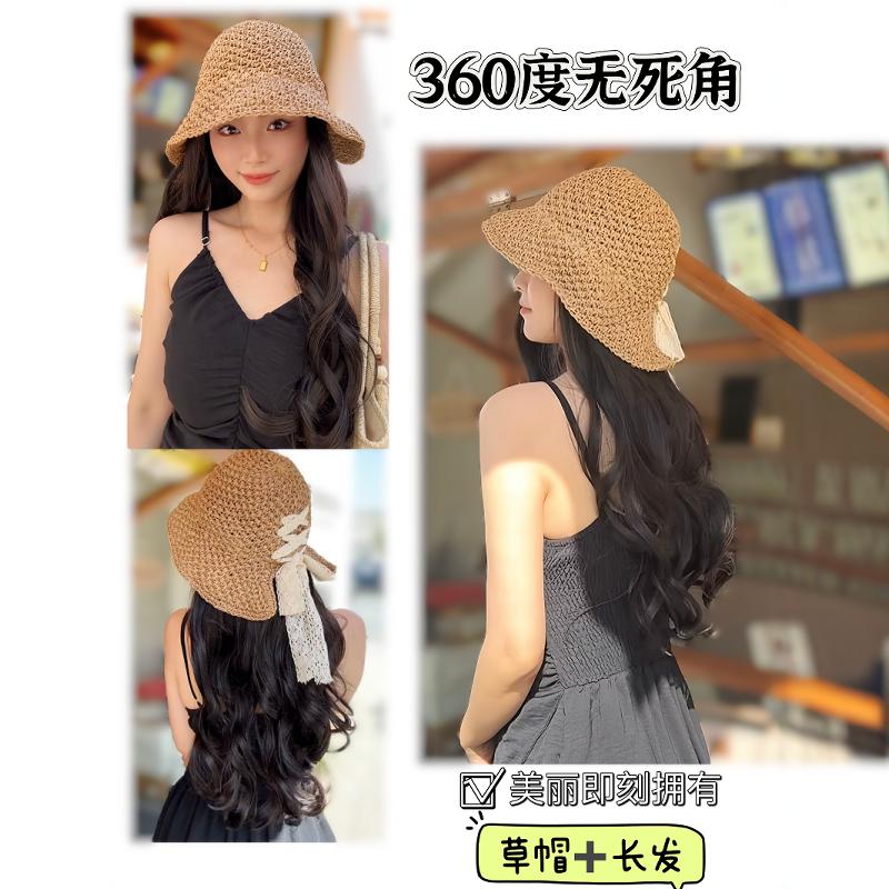 帽子假发一体女长发草帽夏季防晒遮阳度假沙滩蝴蝶结大帽檐仿真发