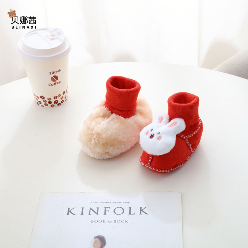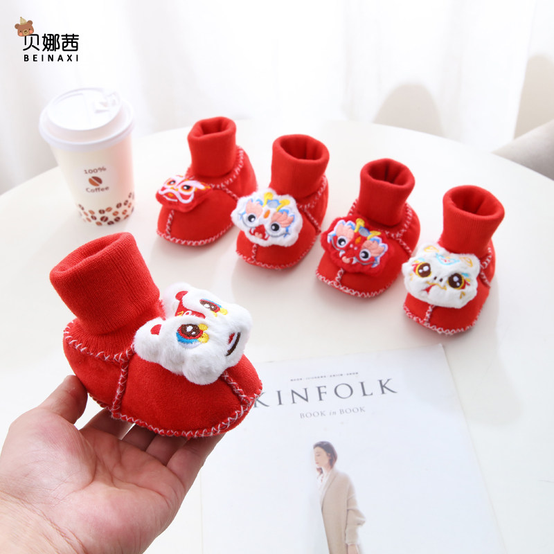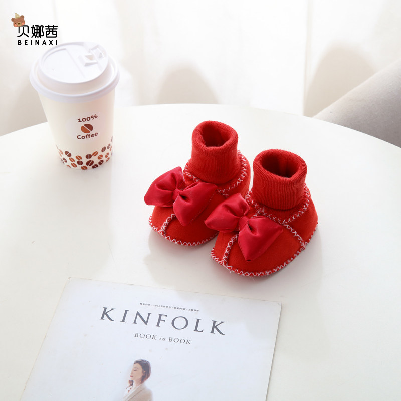 红色婴儿鞋子冬季过年喜庆婴幼儿宝宝满月步前鞋加厚保暖袜套软底