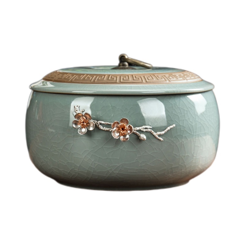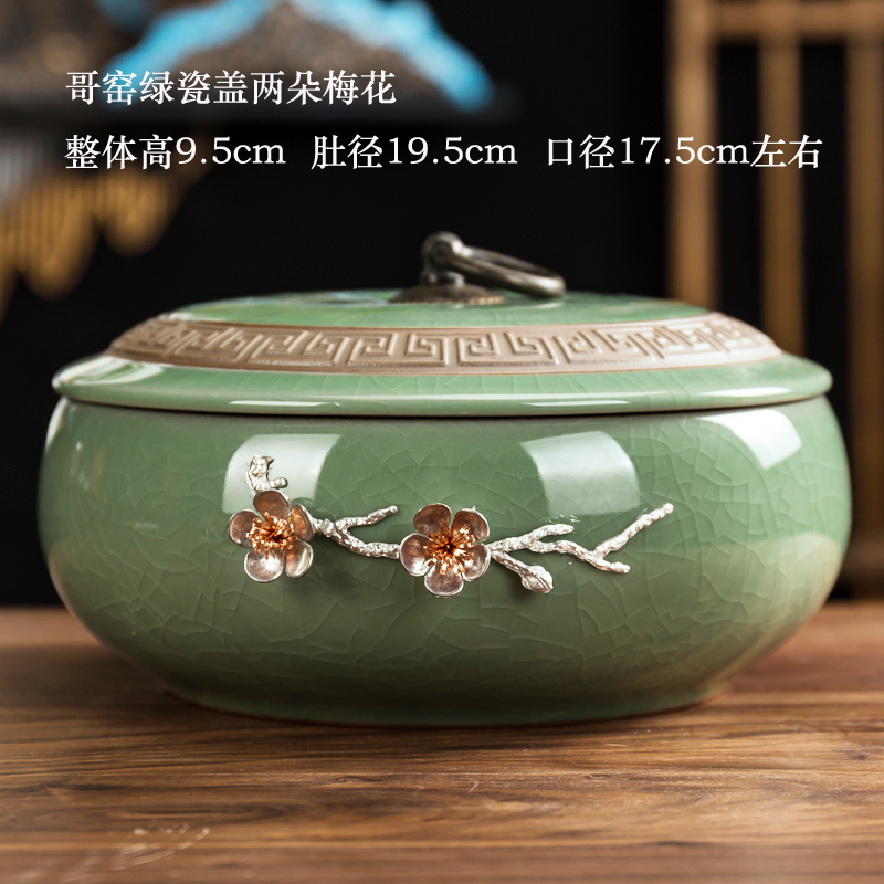 哥窑茶洗开片锡梅花陶瓷盖铜扣
