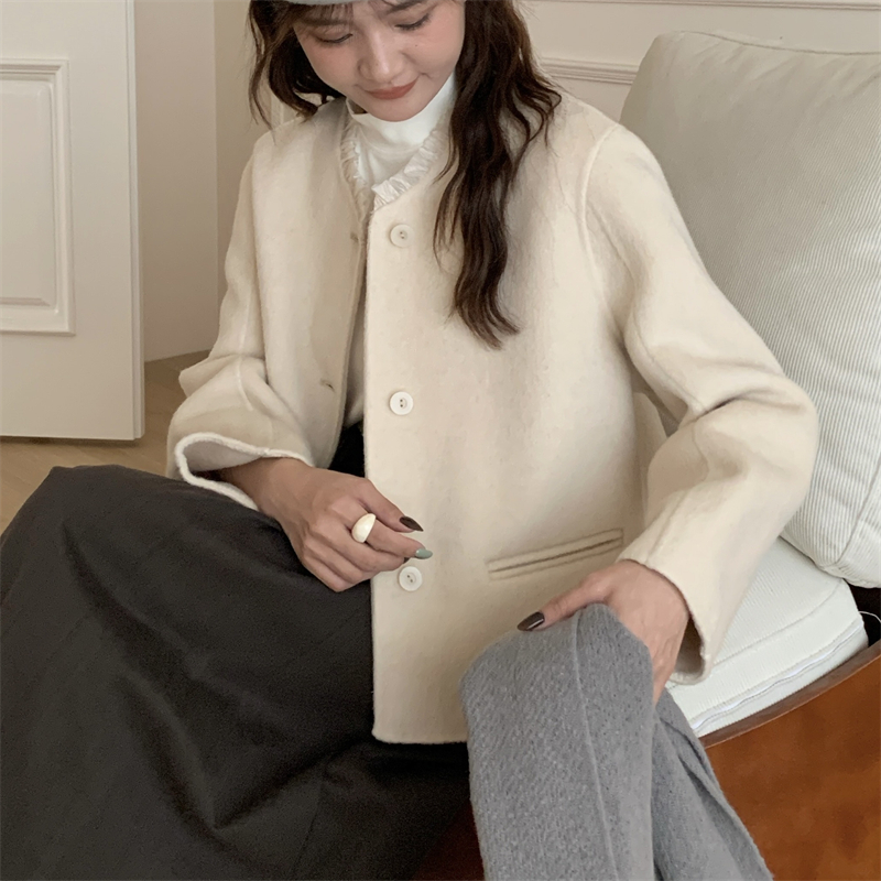初吾家25冬新款韩系羊毛短款上衣大衣双面呢花边毛呢外套小个子女