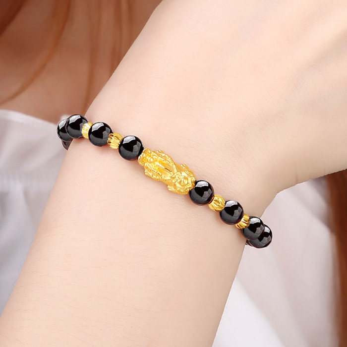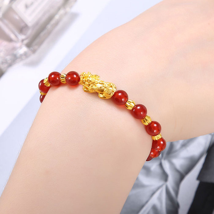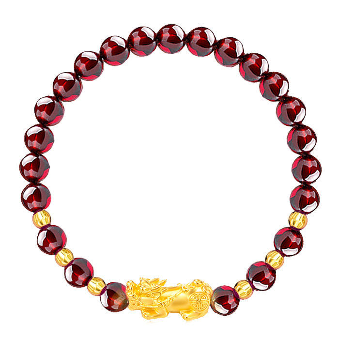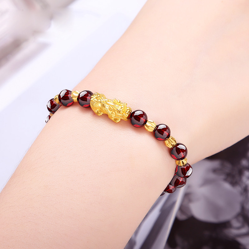 黄金招财貔貅手链3D硬金本命年手串天然酒红石榴石手饰送女友礼物