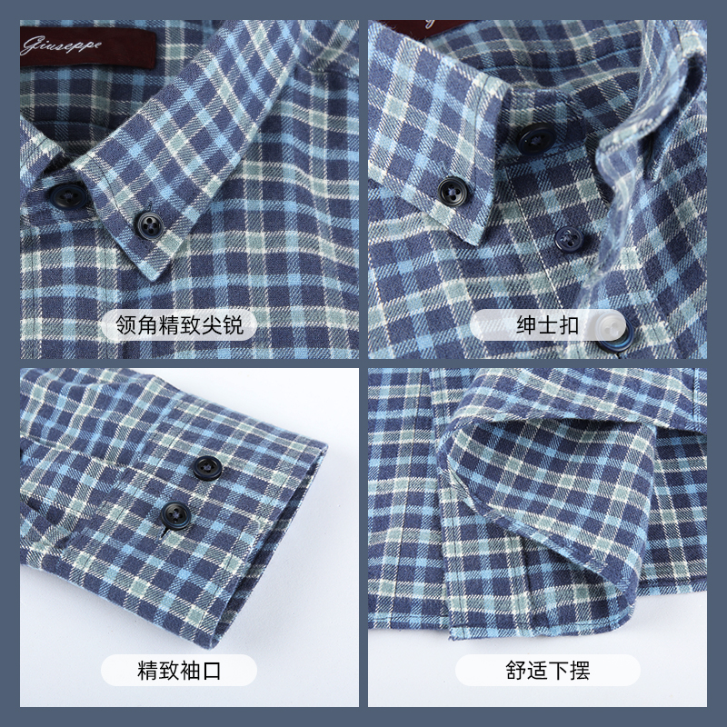 乔治白男士春秋新款蓝绿格纹纽扣领衬衫商务休闲通勤长袖衬衣