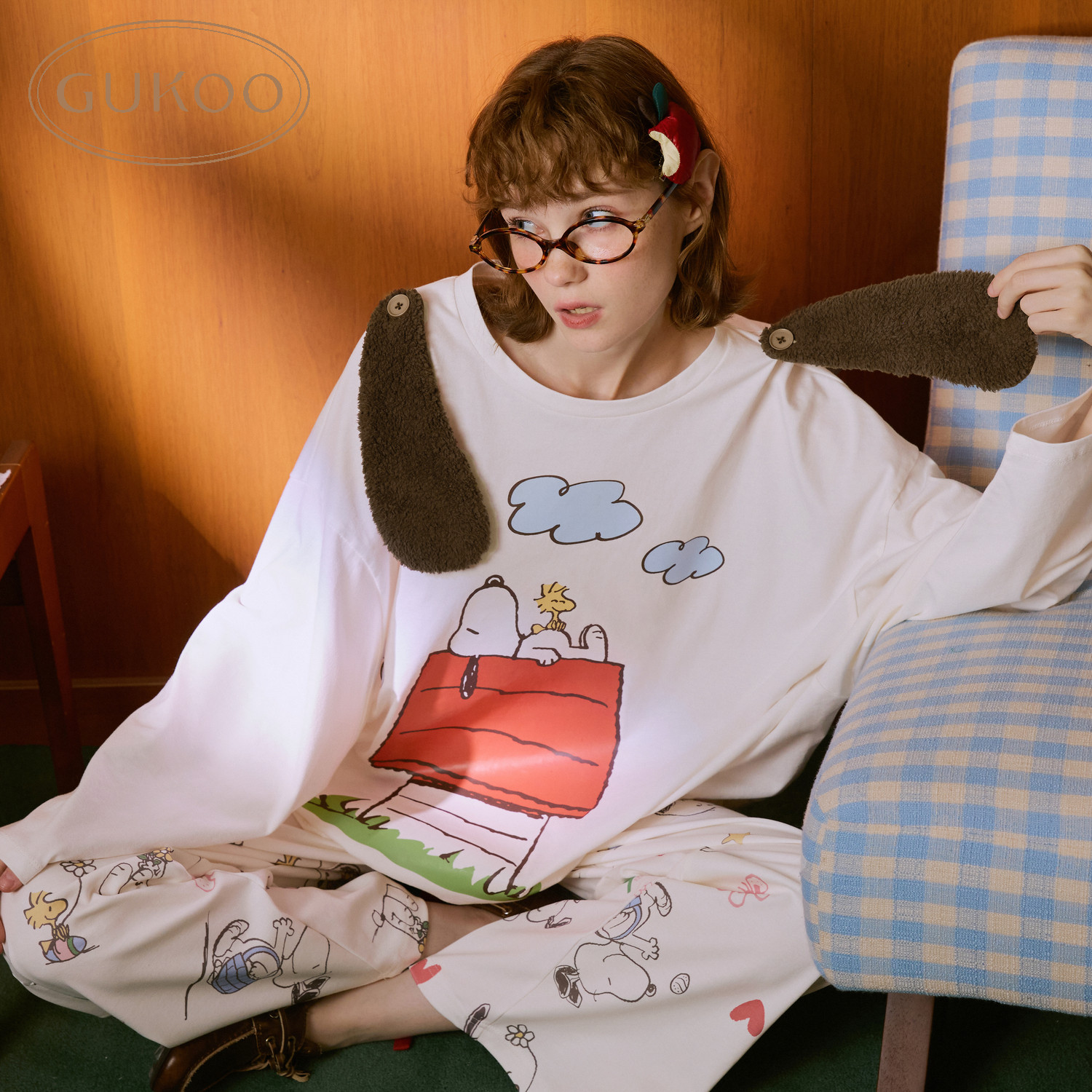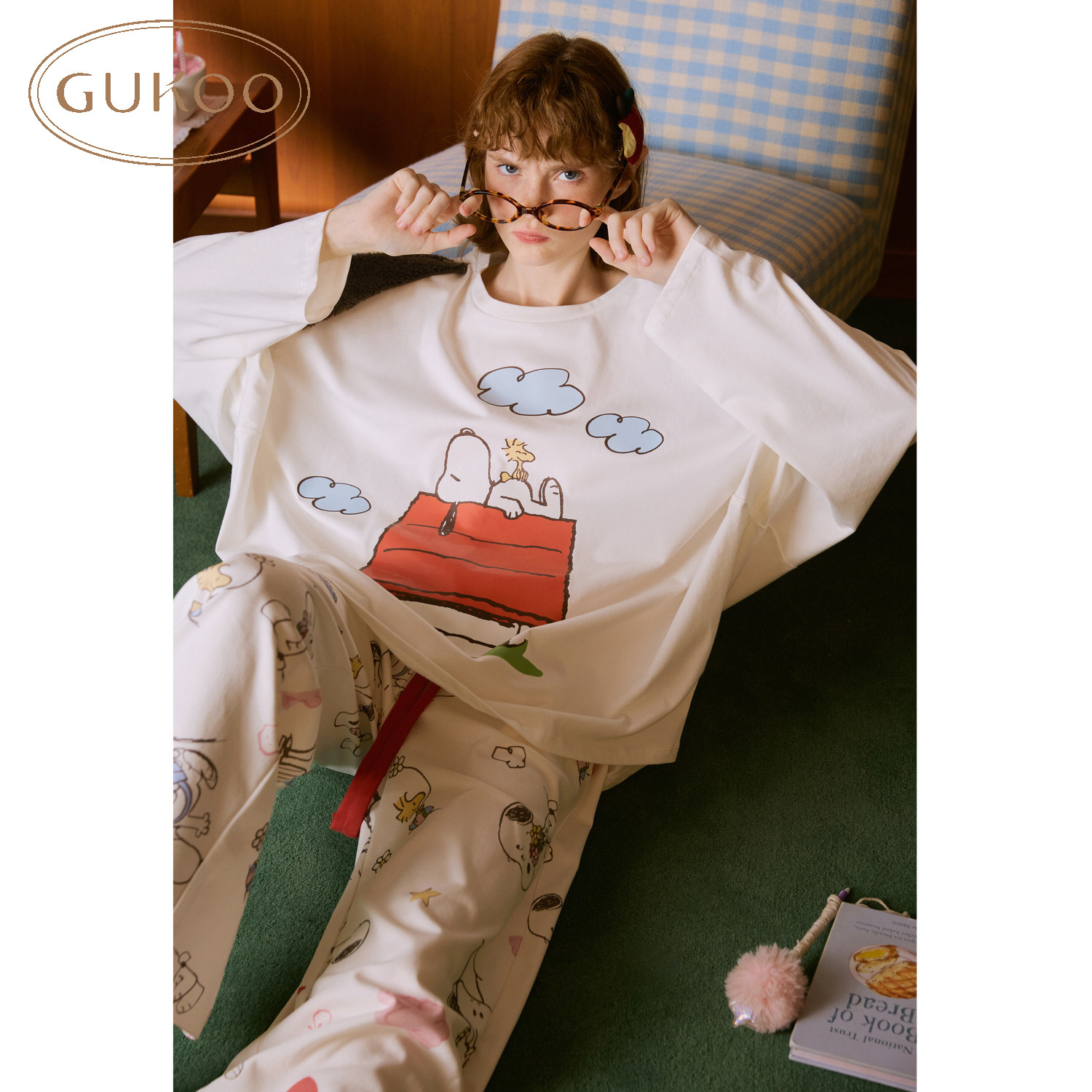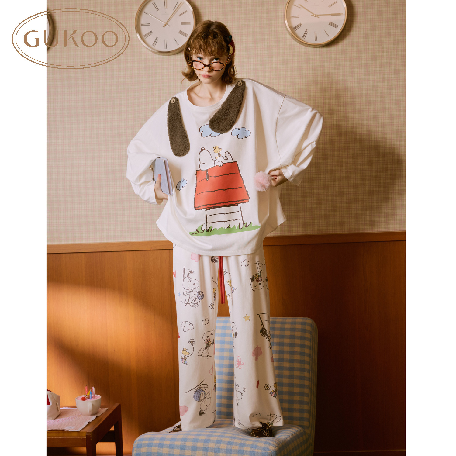 Gukoo/果壳睡衣女春夏史努比联名新款纯棉可爱女士家居服套装A