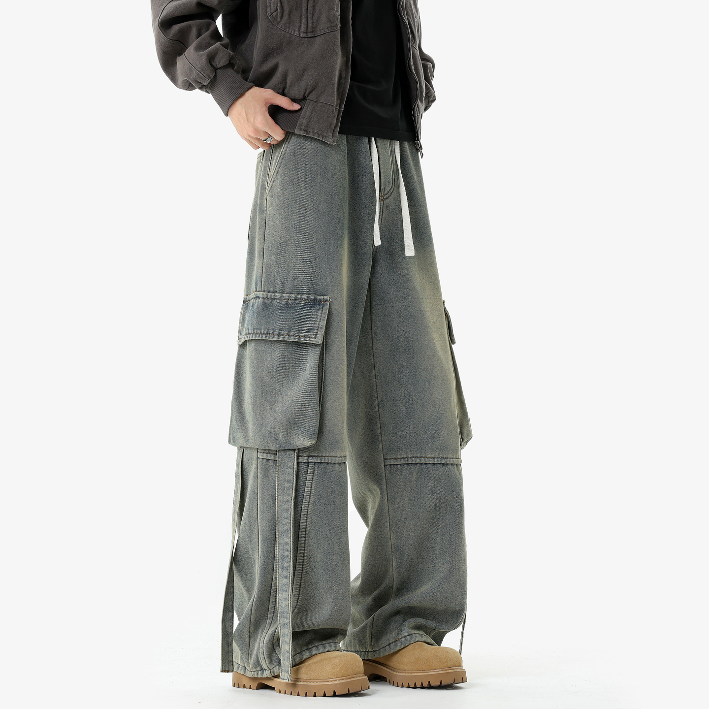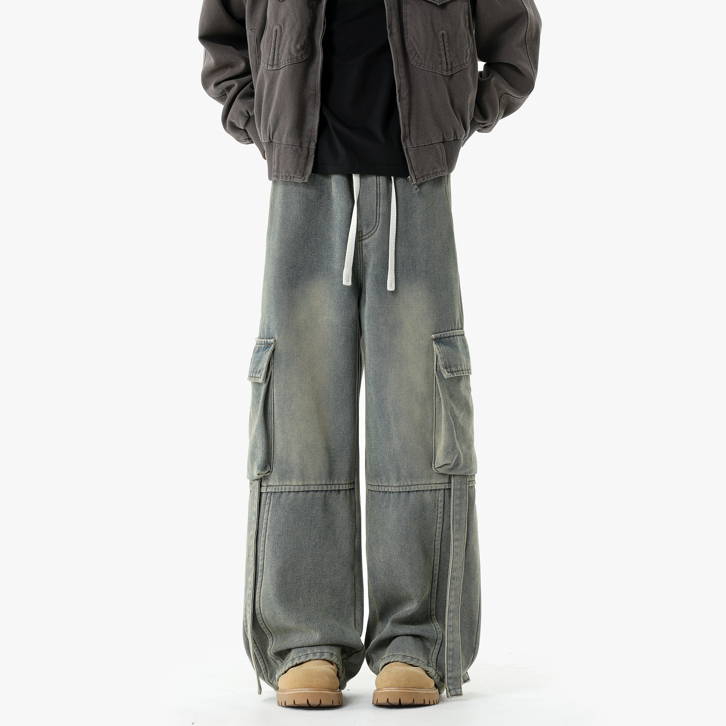 悟空有货美式潮牌大口袋水洗加绒牛仔裤男女复古宽松阔腿保暖长裤