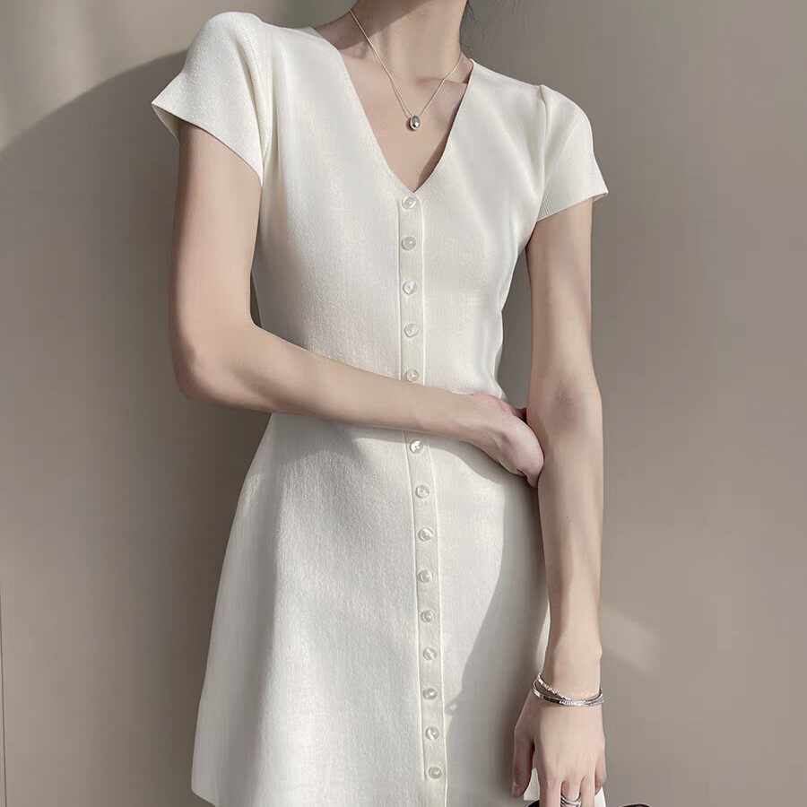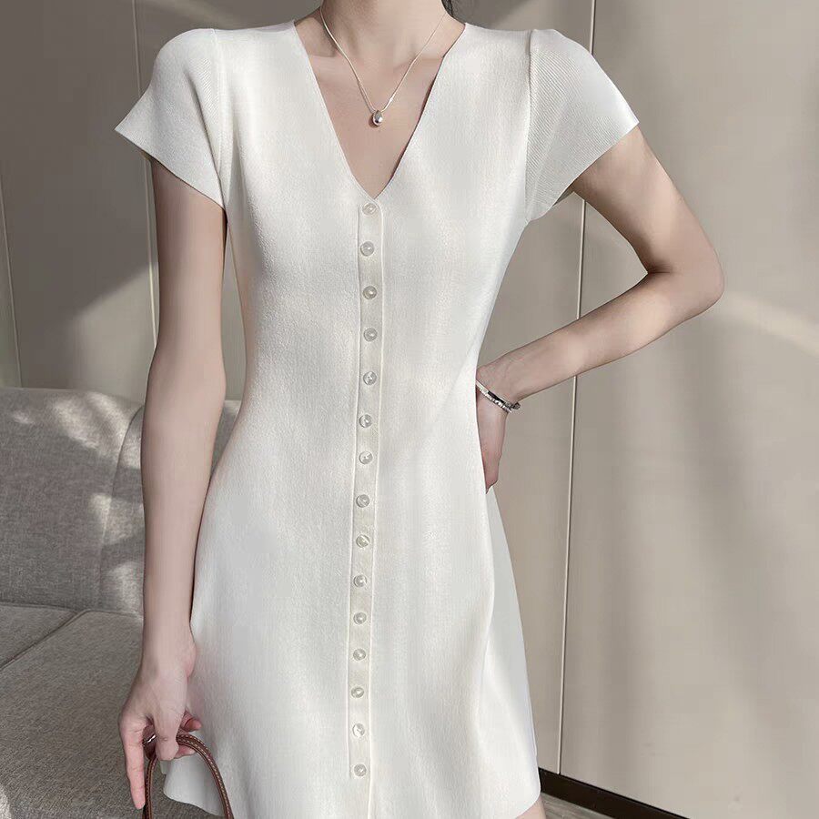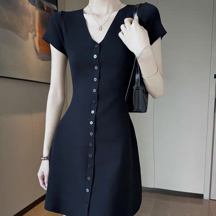 v领短袖冰丝针织连衣裙夏季小众新款女装气质显瘦收腰短裙