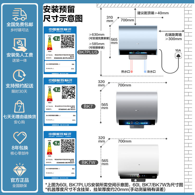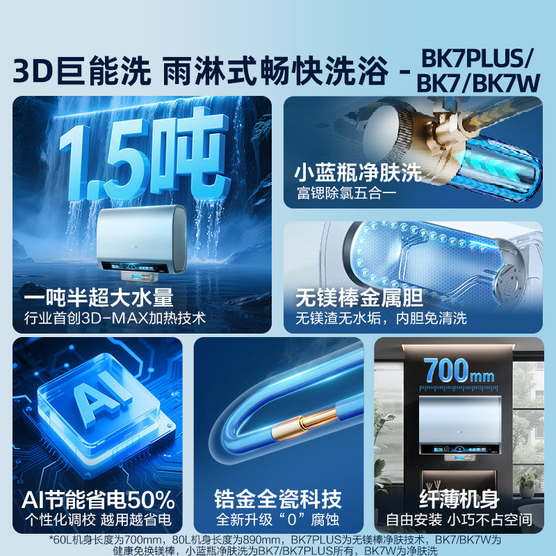 海尔麦浪电热水器家用官方3D速热洗澡小蓝瓶扁桶双胆一级能效省电