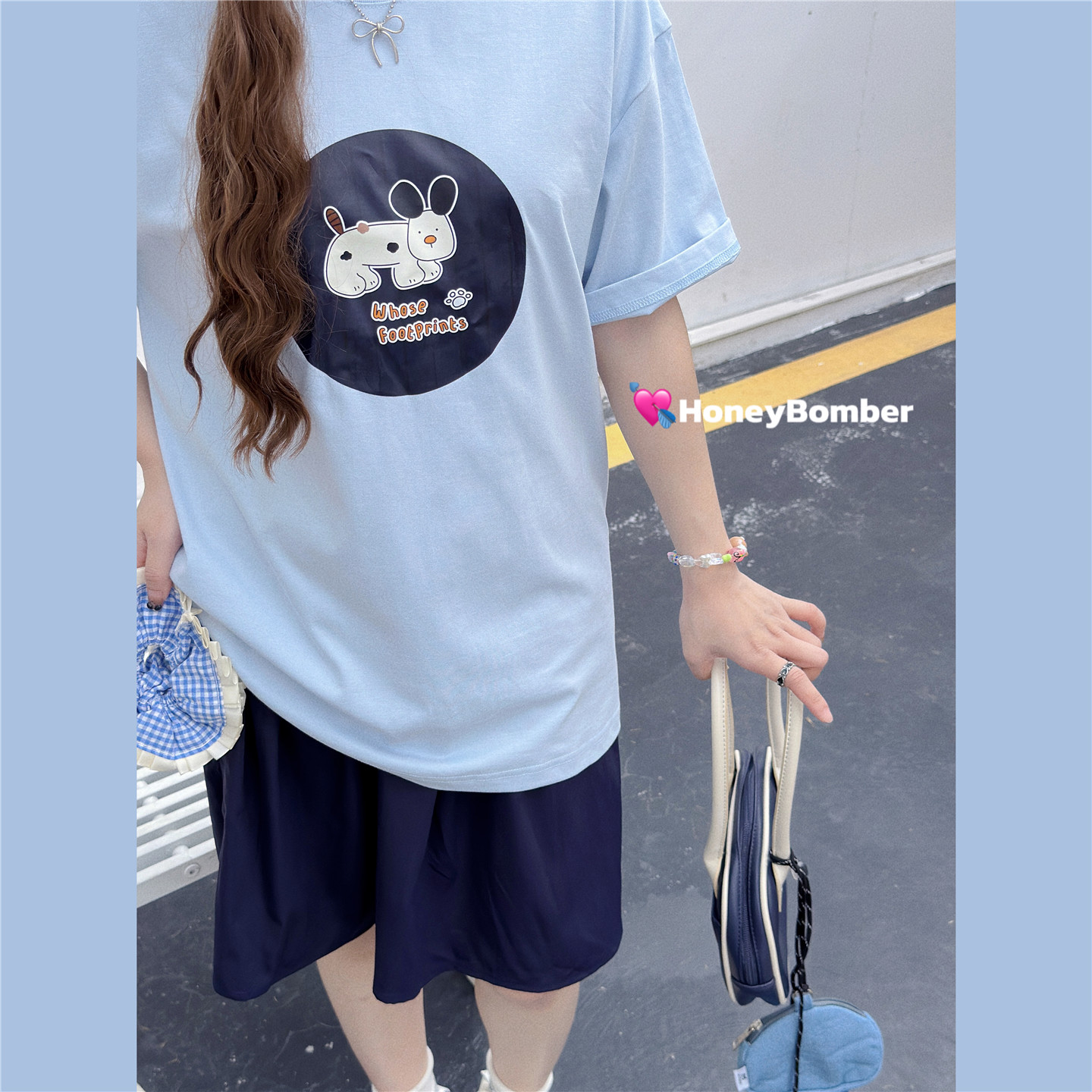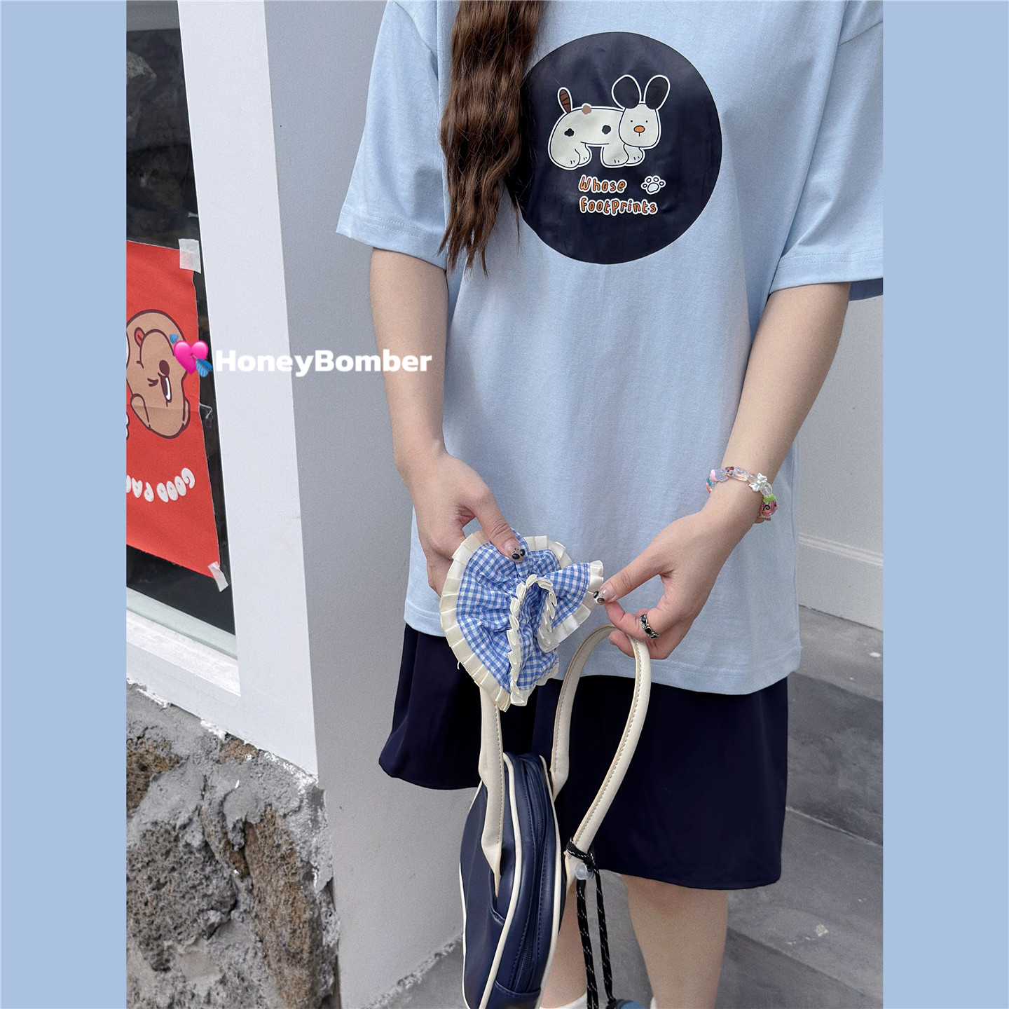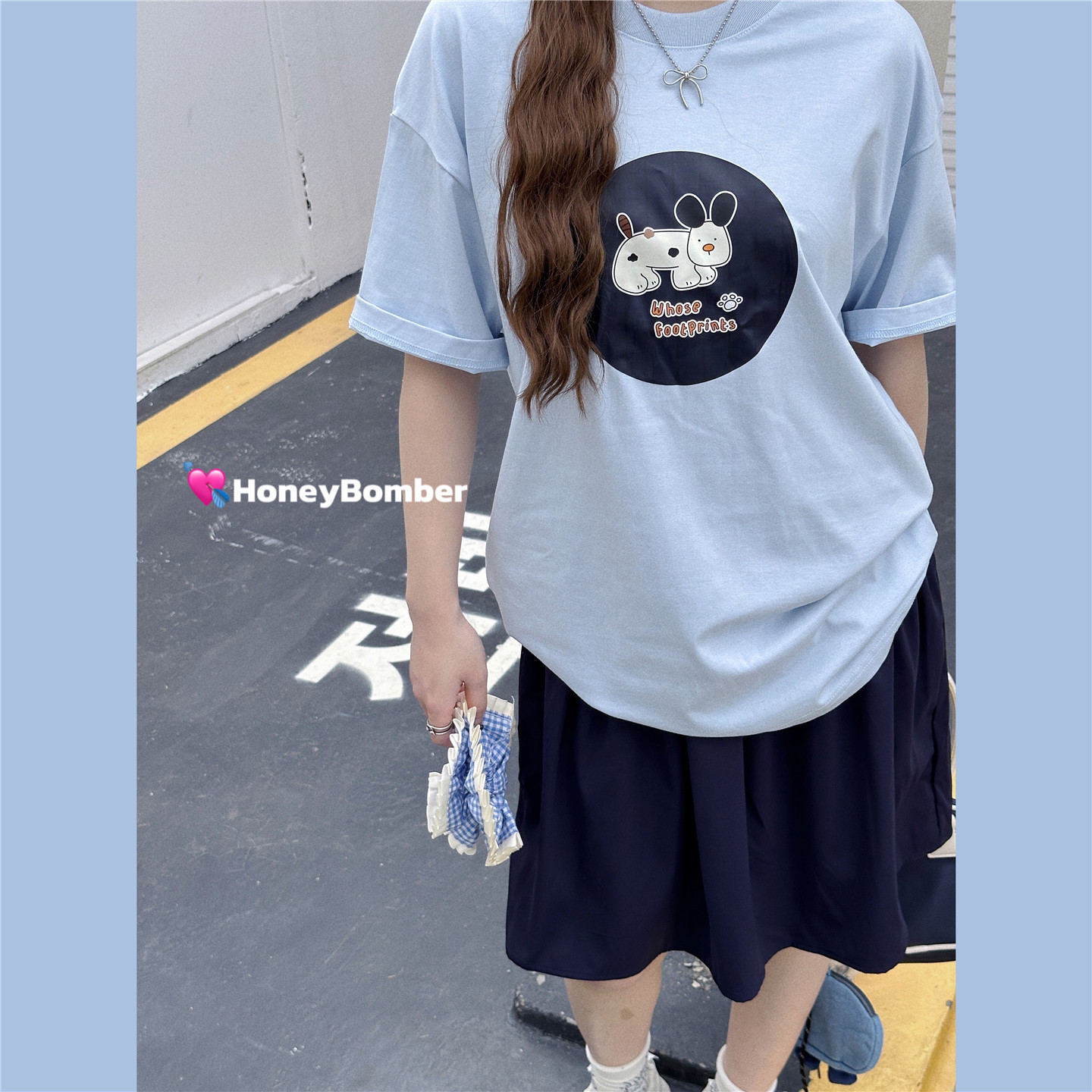 甜心轰炸机日系 复古浅蓝色盐系宽松美式小狗短袖T恤女上衣情侣