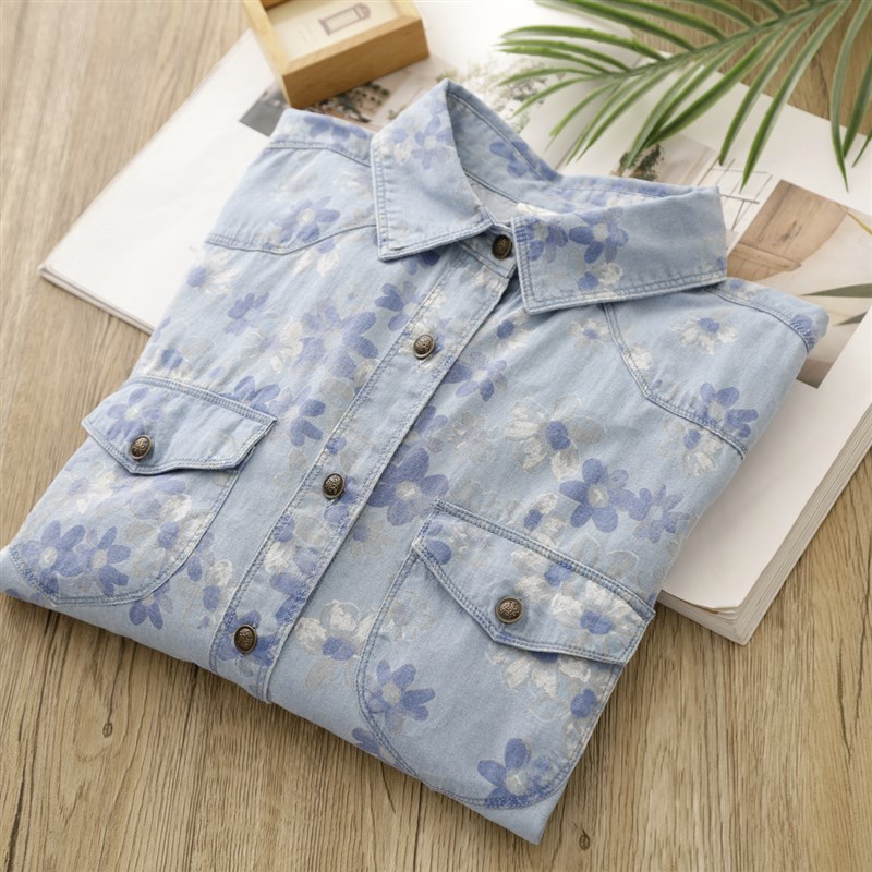 清新花朵牛仔衬衫女装2023秋季新款甜美翻领棉质长袖宽松休闲衬衣