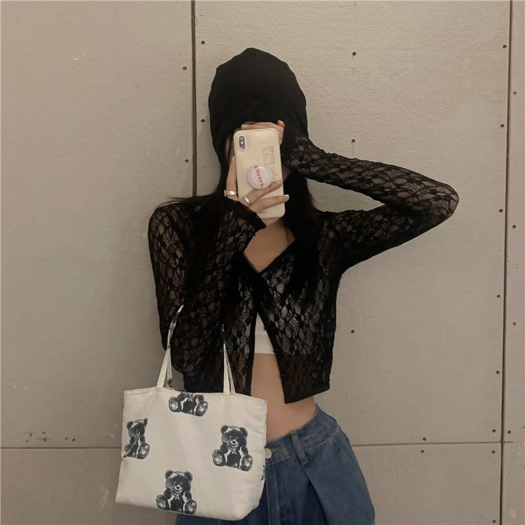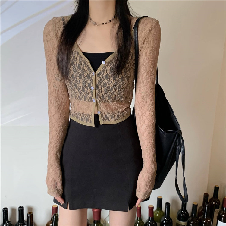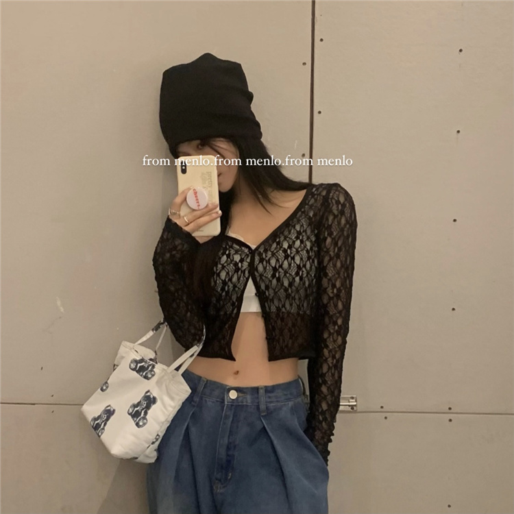 黑色蕾丝防晒开衫外套女夏薄款长袖镂空罩衫法式小众别致短款上衣