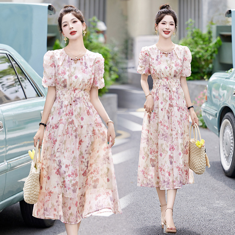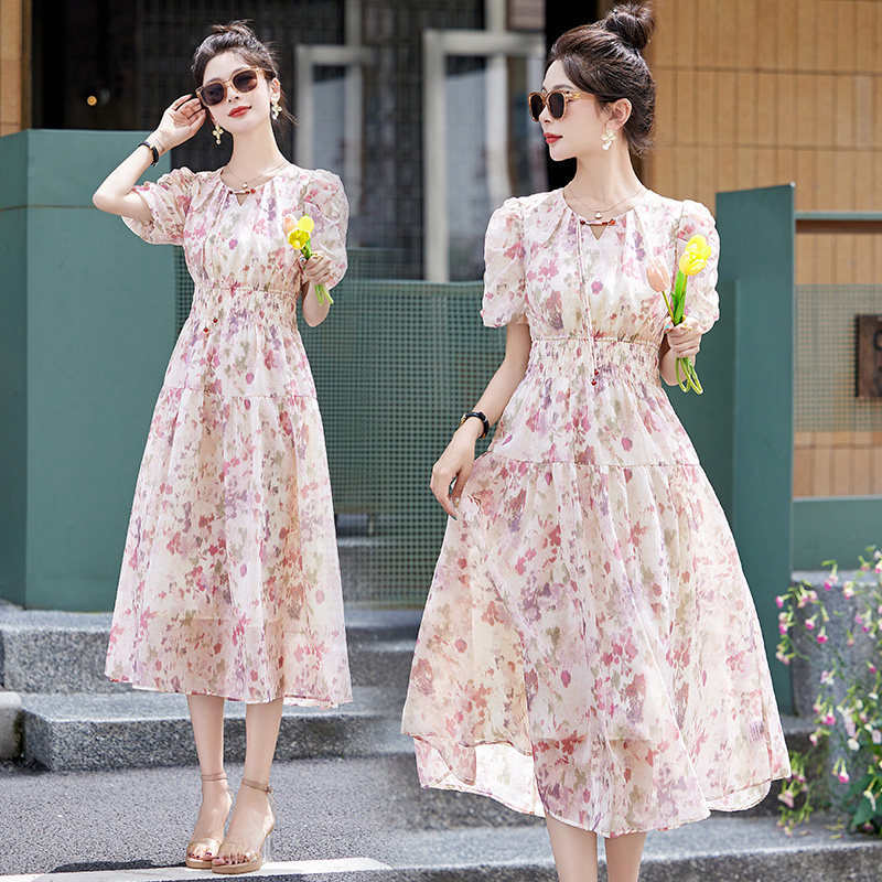 2024夏装新款收腰显瘦碎花雪纺连衣裙女夏中长款裙子仙女气质优雅