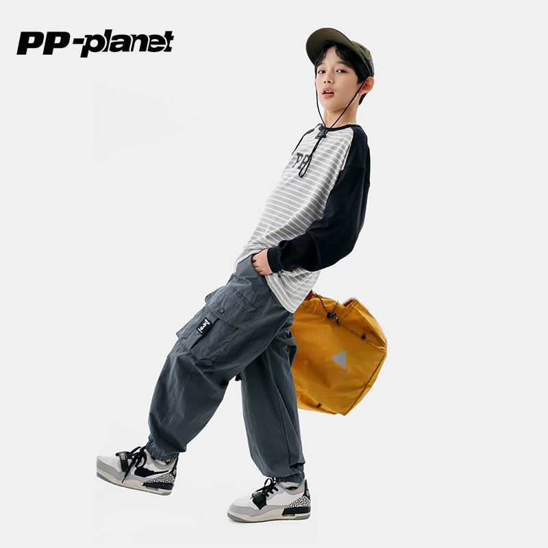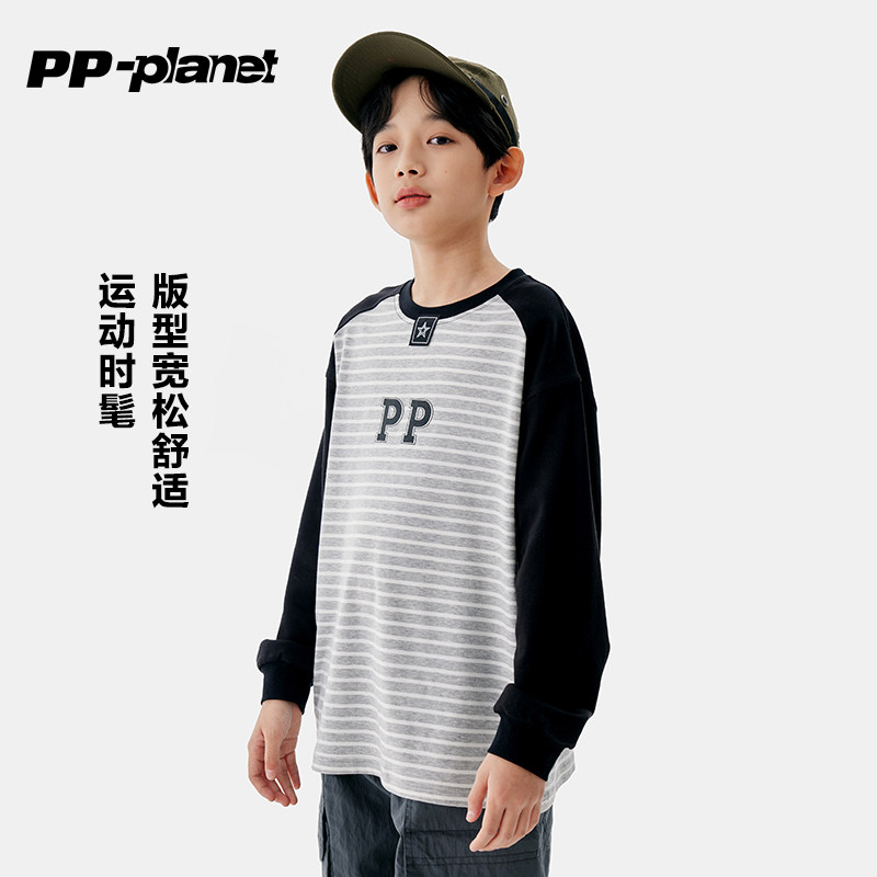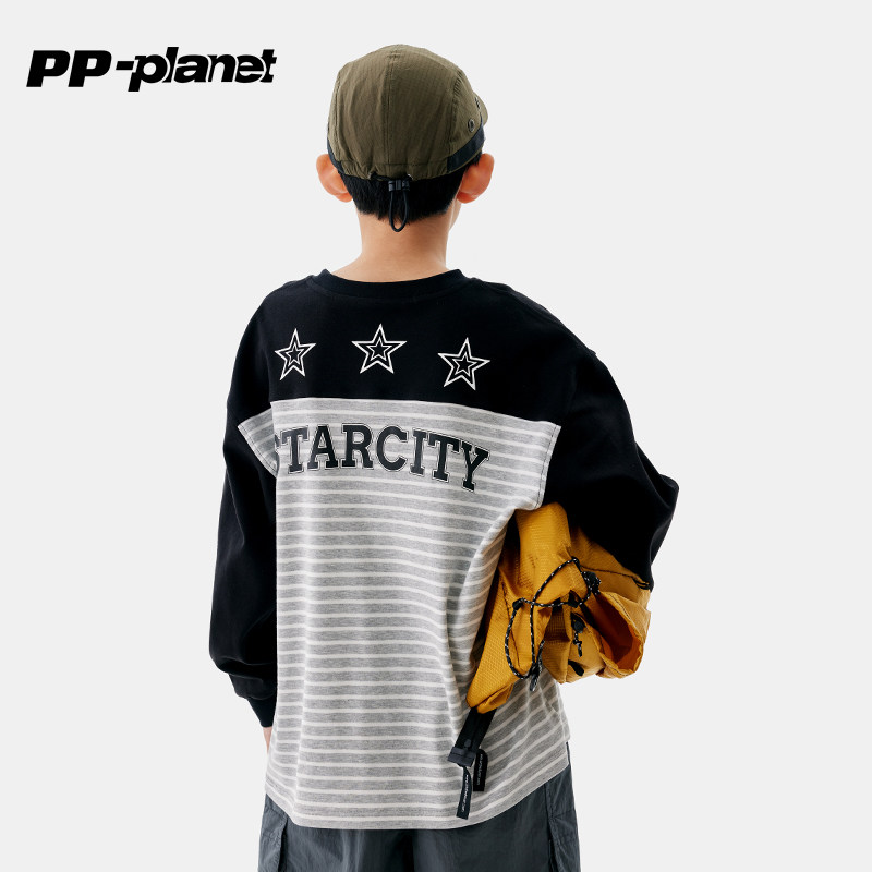 PP星球儿童春秋新款长袖条纹T恤中大童拼色上衣男童休闲体恤
