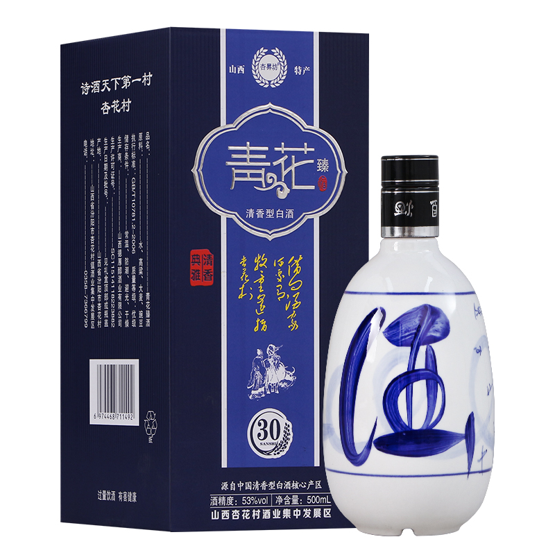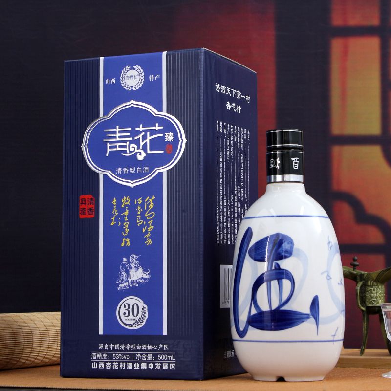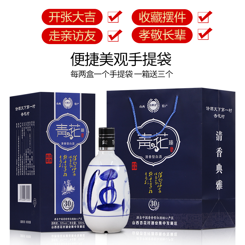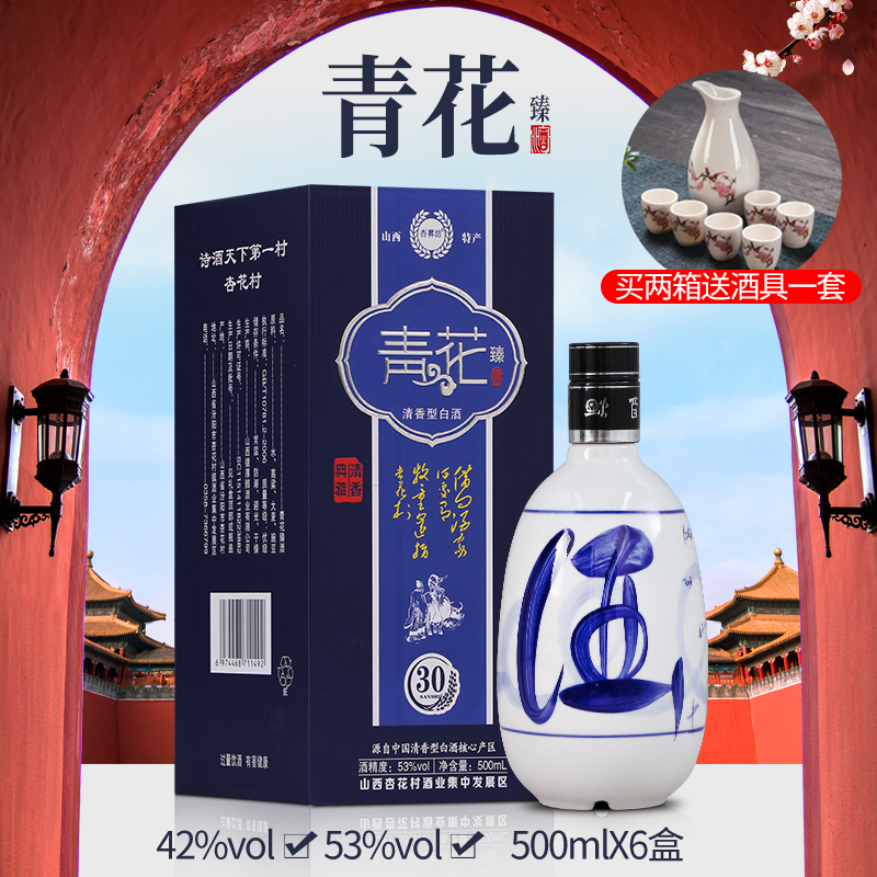 山西杏花村青花白酒53度清香型高度白酒纯粮食老酒500ml整箱6盒装