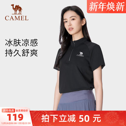 骆驼女装短袖T恤女夏季新款冰丝透气防晒休闲骑行运动立领上衣女