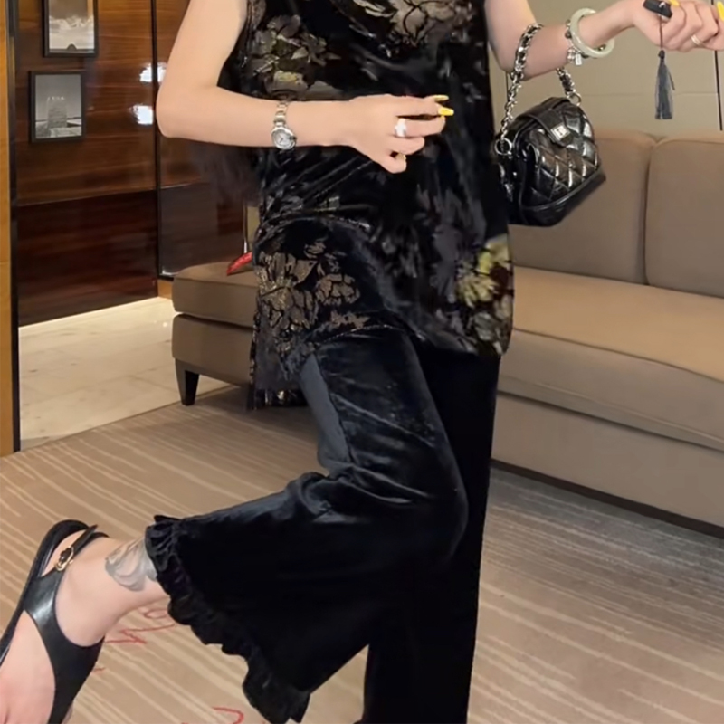 欧货2025年夏季新款时尚木耳边丝绒微喇裤女弹力显瘦休闲九分裤子