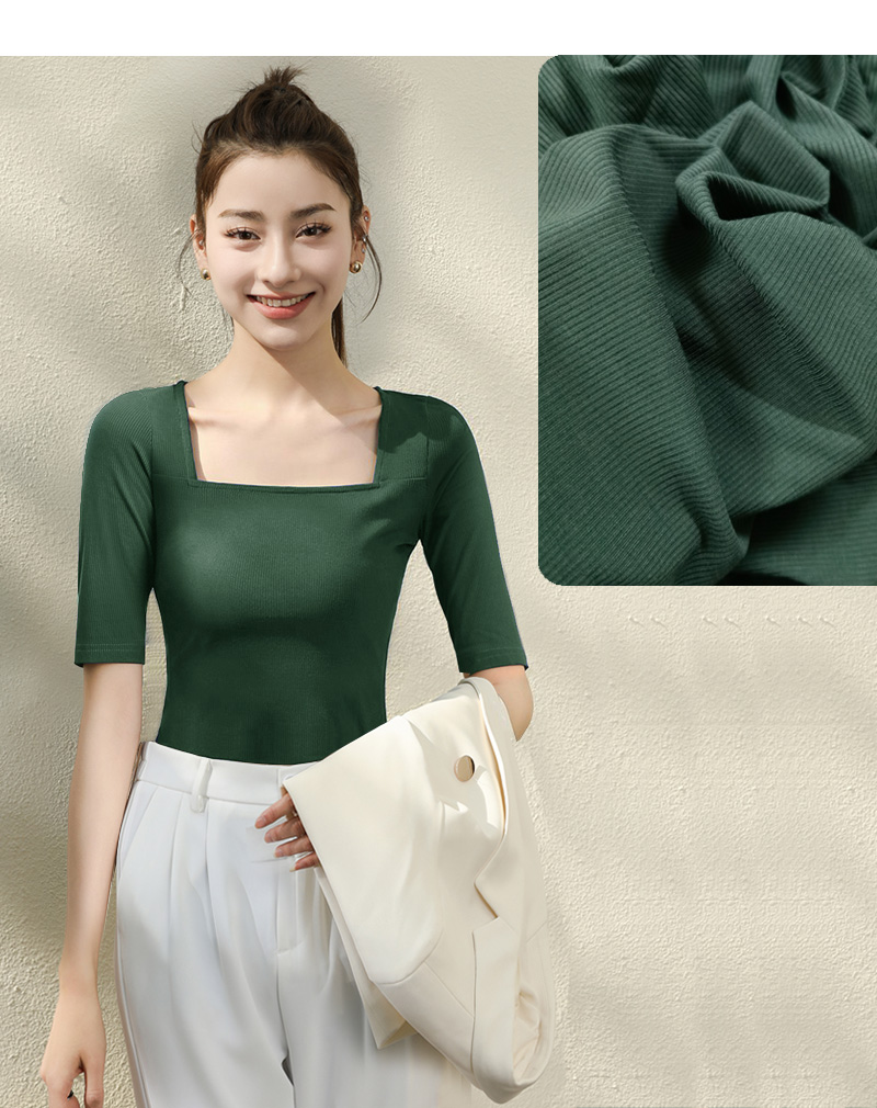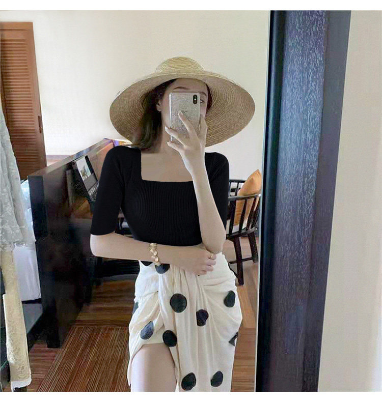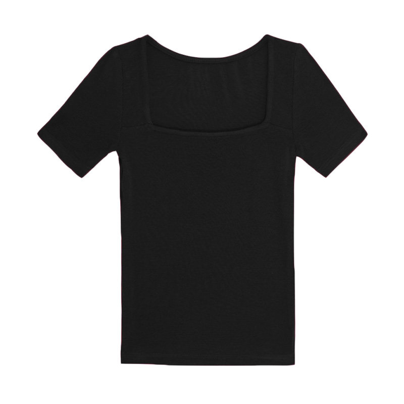 法式复古方领黑色t恤女装2025夏装中袖紧身露锁骨上衣修身短袖