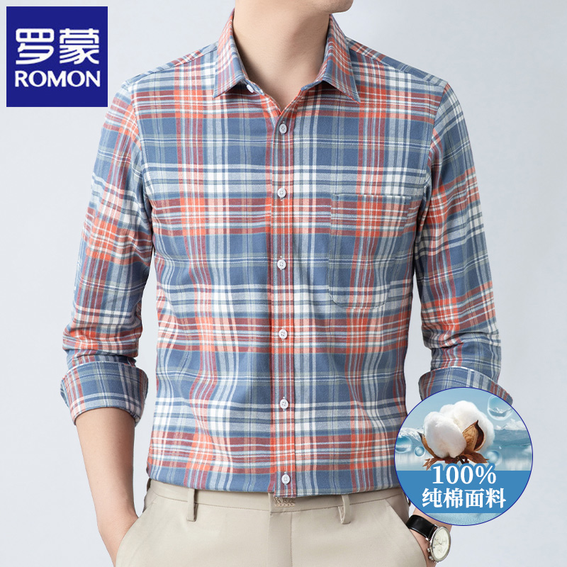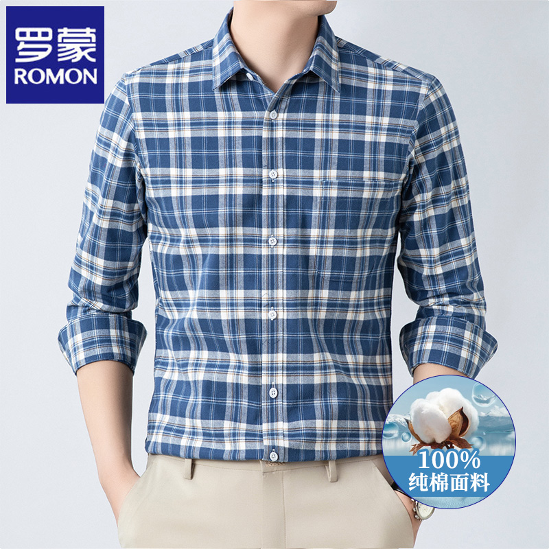 罗蒙春秋新款纯棉衬衫男格子上衣