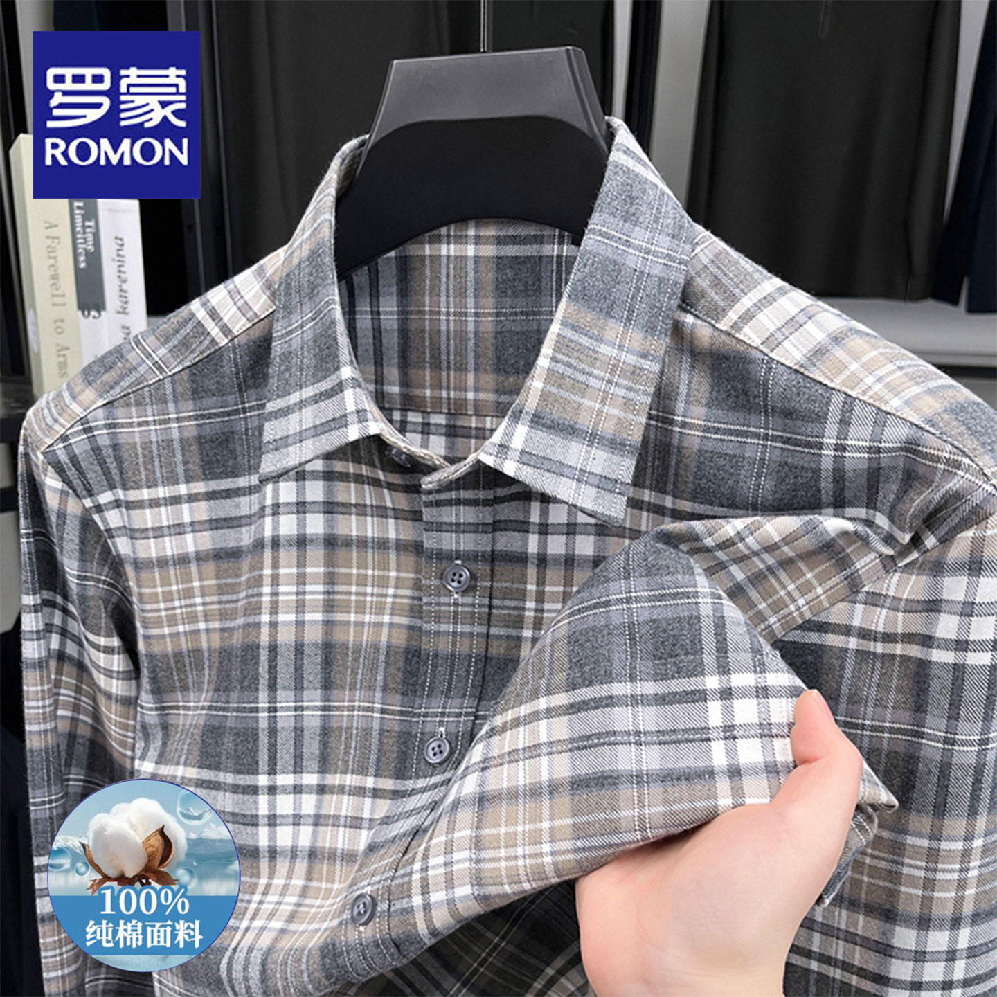 罗蒙磨毛纯棉长袖衬衫男2025春秋季新款外穿上衣商务休闲格子衬衣