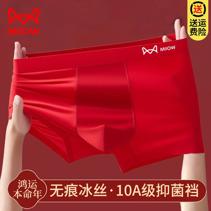 猫人男士内裤本命年红色无痕冰丝抗菌平角男结婚夏季透气四角短裤