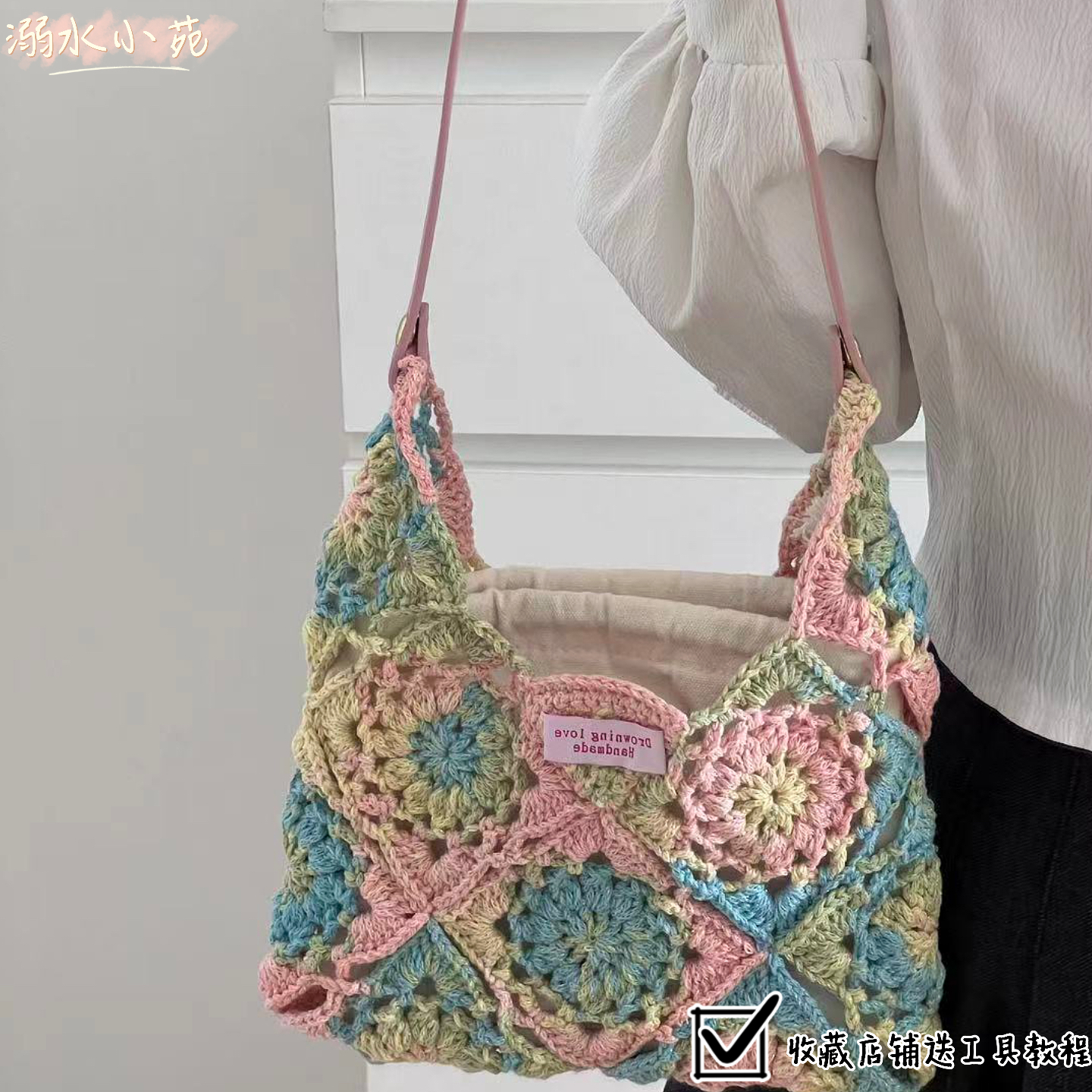 溺水小苑自制手工钩针编织花片段染蔷薇单肩包diy材料包