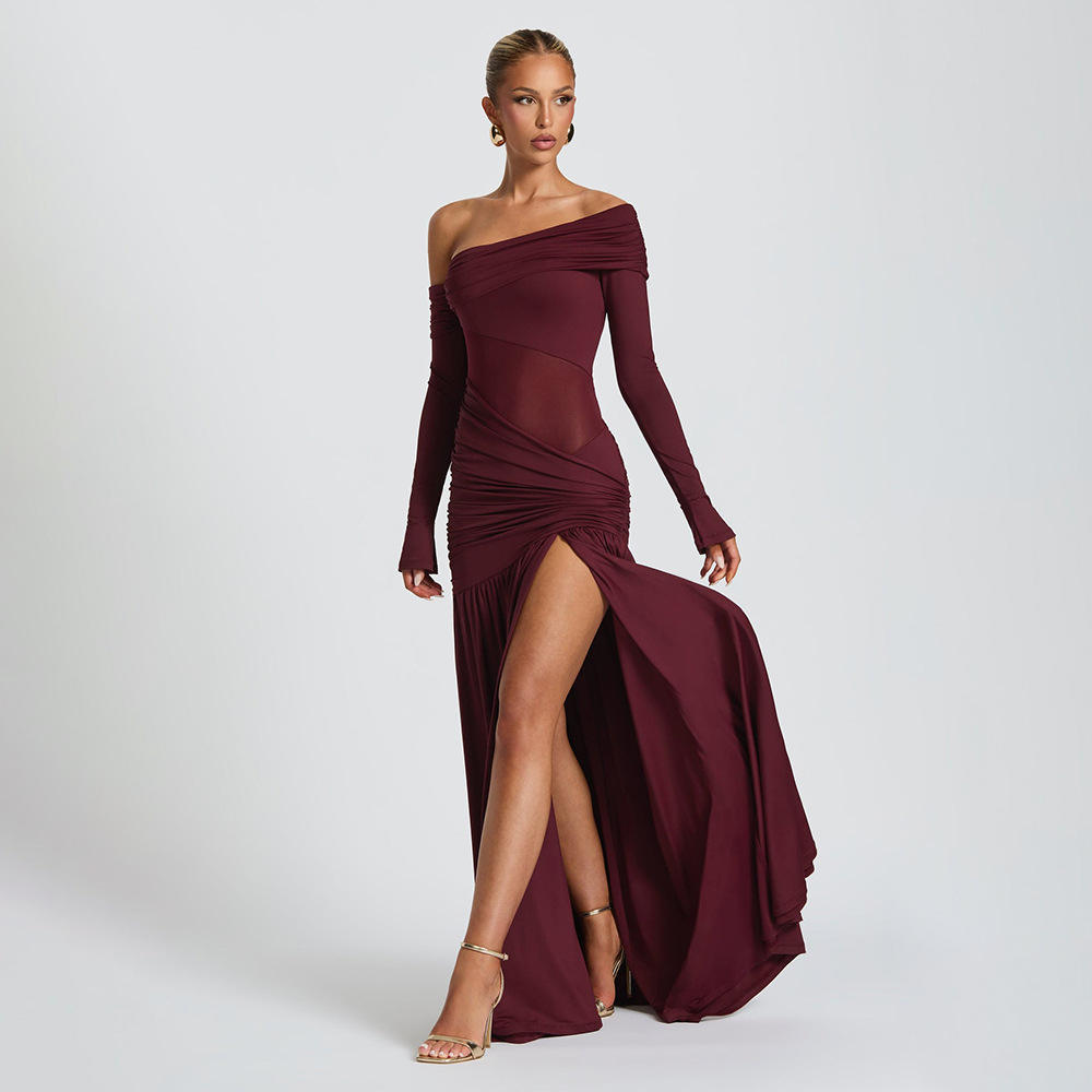 欧美风夏季优雅外贸抹胸性感网纱拼接缩褶开叉连衣裙女高腰裙单件