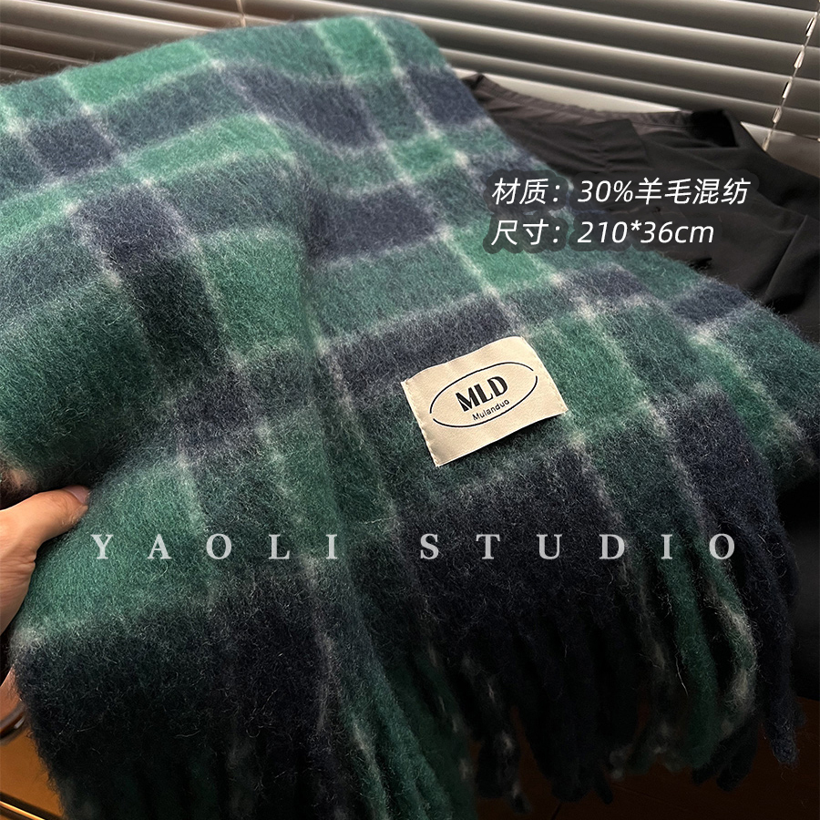 YAOLI清冷蓝绿格子~软糯拉毛围巾女秋冬保暖防寒含羊毛披肩围脖