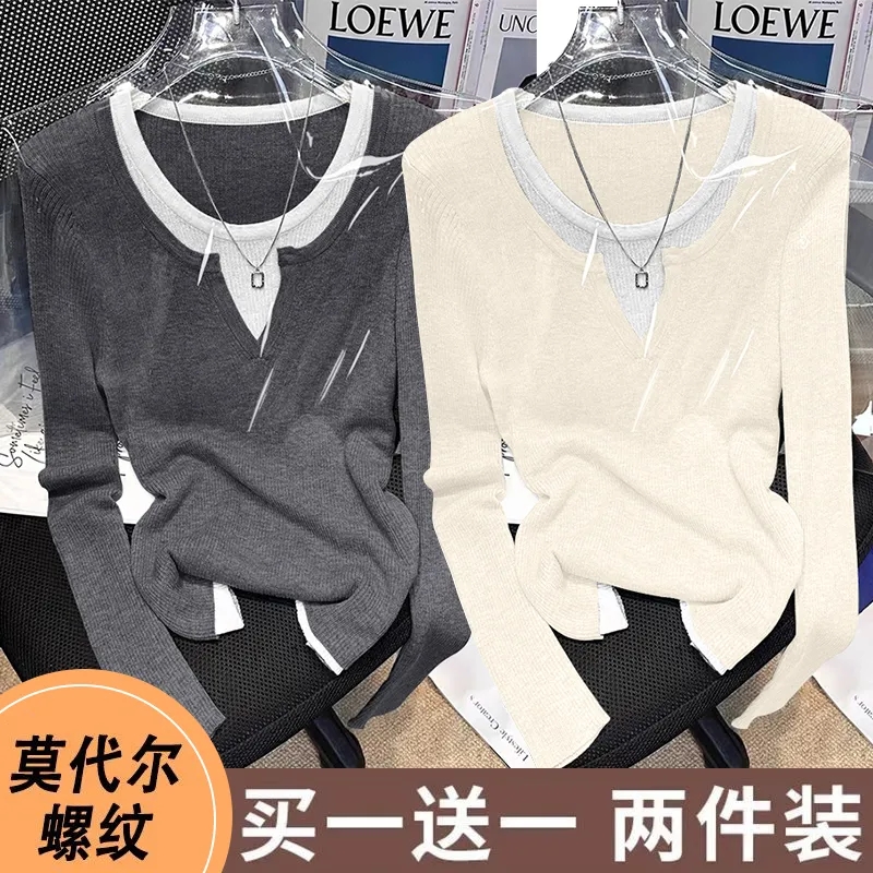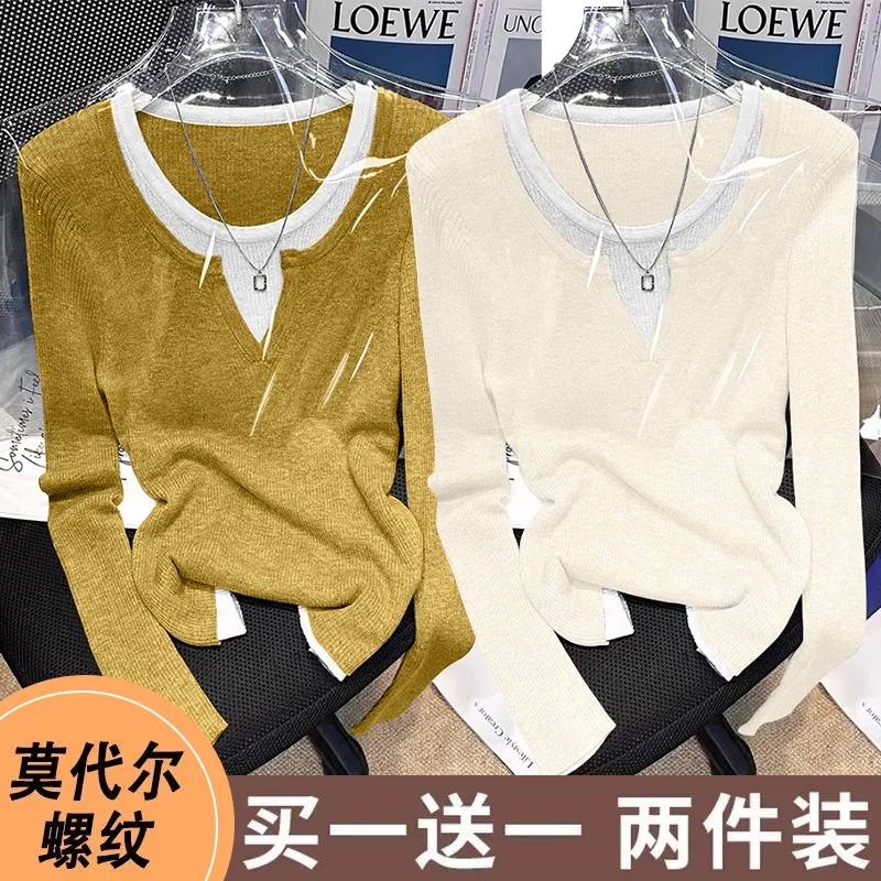 单/两件 莫代尔撞色假两件V领打底衫女内搭春秋冬修身拼接长袖t恤