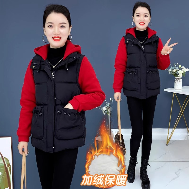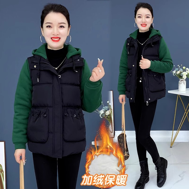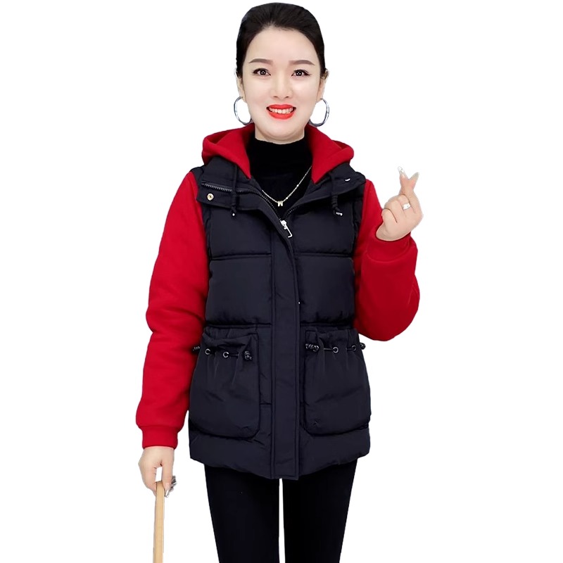 加绒加厚冬季新款连帽马甲假两件棉服短外套女士时尚拼接保暖棉衣