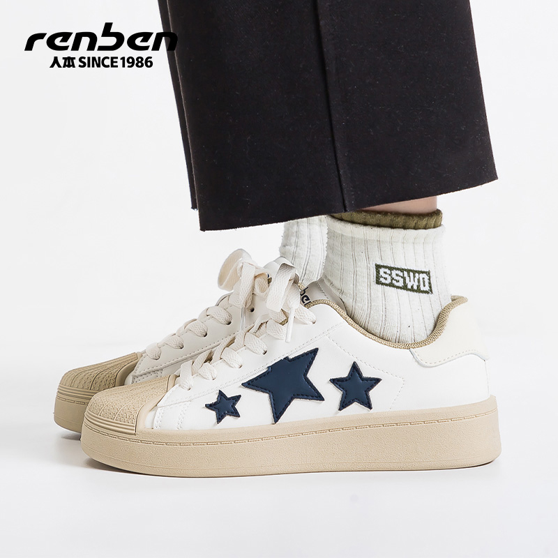 人本贝壳头星星小白鞋女款2025春秋新款厚底日系百搭休闲运动板鞋