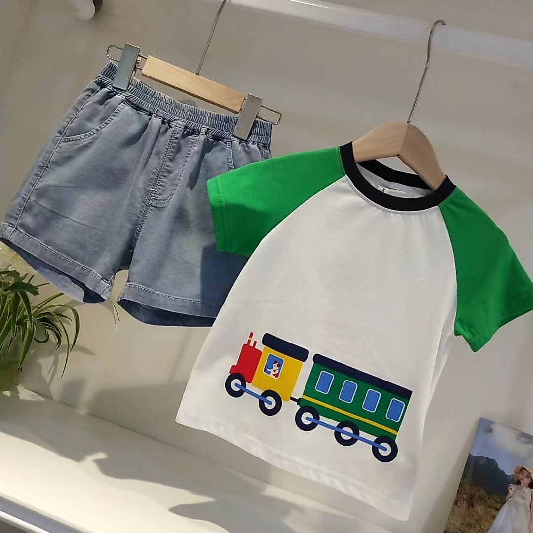 宝宝T恤新款夏季新款洋气小童短袖男童男孩条纹汽车纯棉上衣半袖