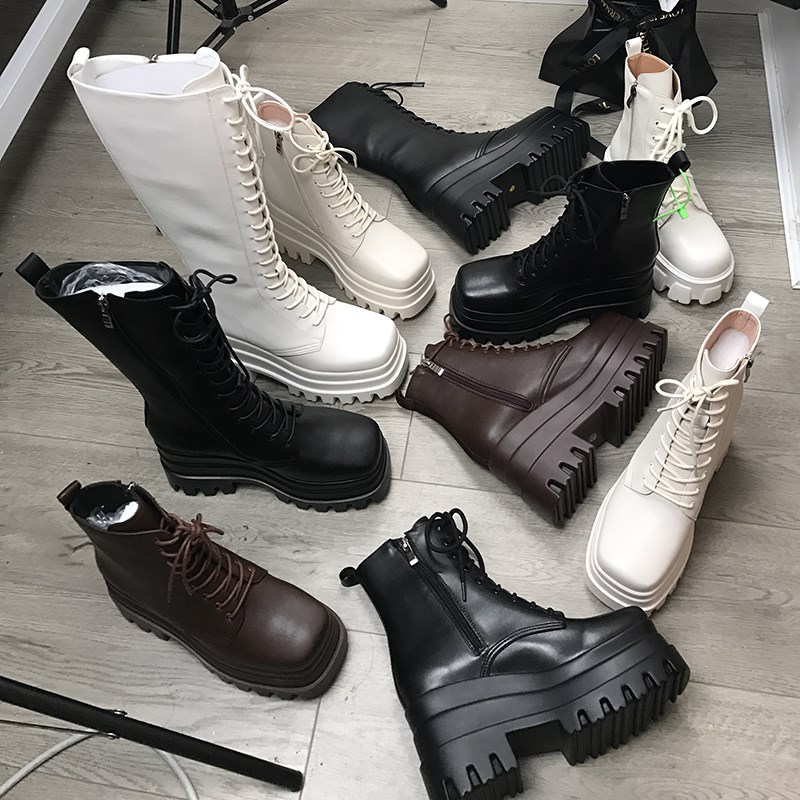 秋冬新款坡跟女鞋松糕跟靴子中筒厚底马丁靴方头绑带W机车高靴加