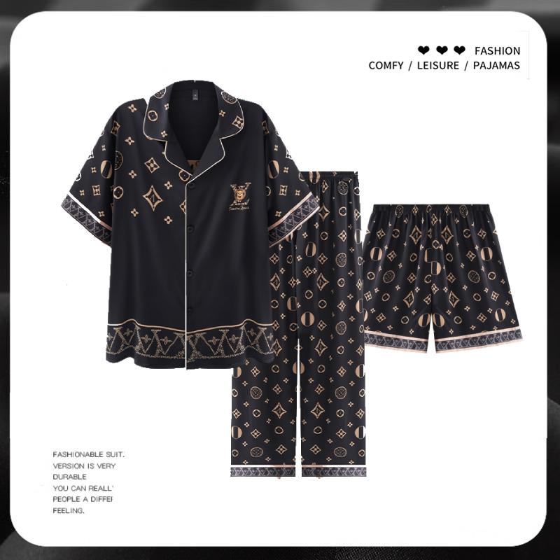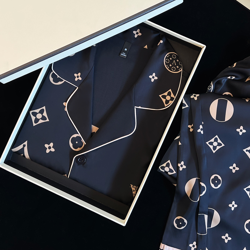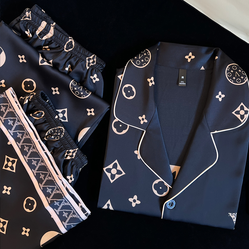 冰丝情侣睡衣2025新款潮牌字母印花衬衫领宽松直筒家居服套装轻奢