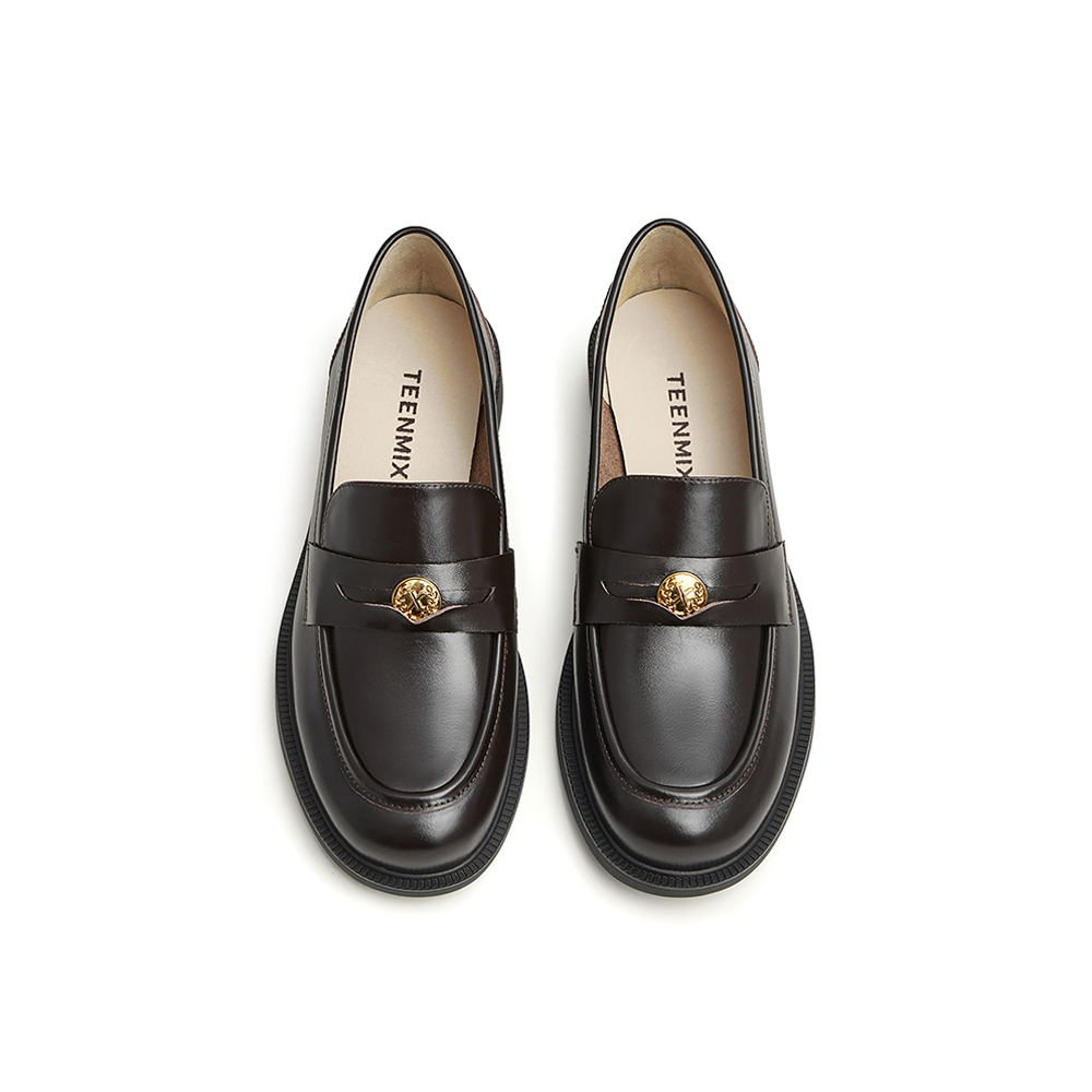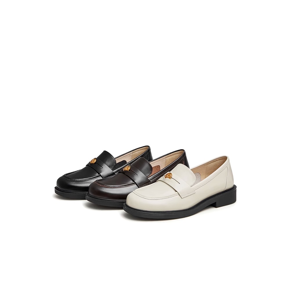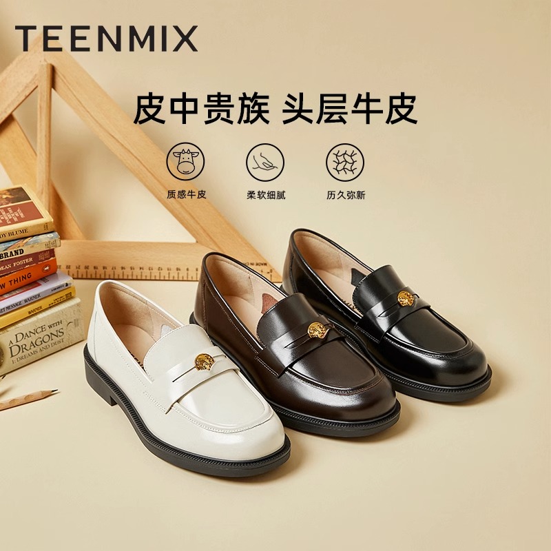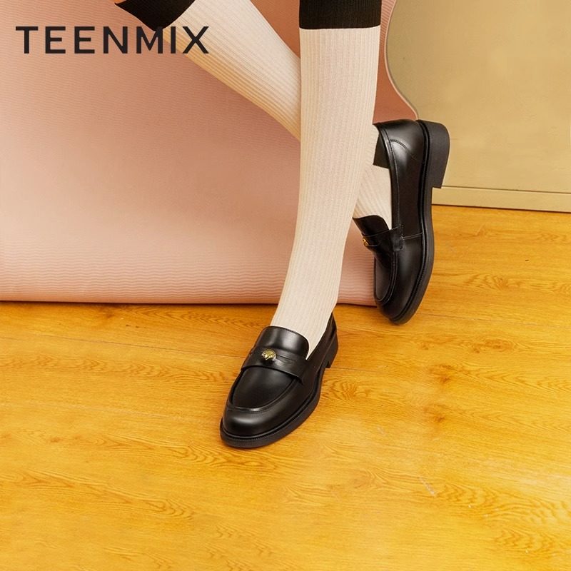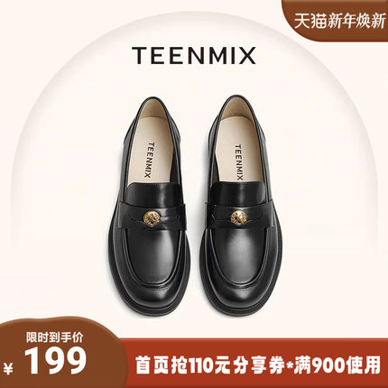 天美意春夏新款黑色平底乐福鞋英伦风一脚蹬女鞋CXC12AA3