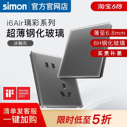 西蒙开关插座i6Air冰釉灰超薄磨砂钢化玻璃面板五孔官方官网店M7