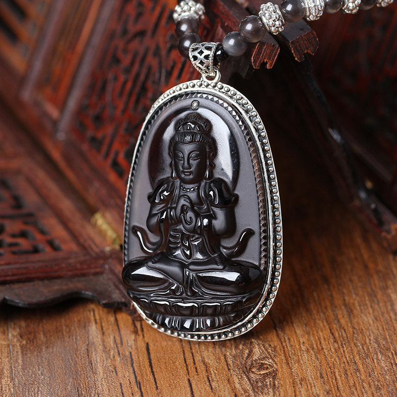 天然冰种银包边黑曜石大日如来生肖羊猴本命佛守护神吊坠项链