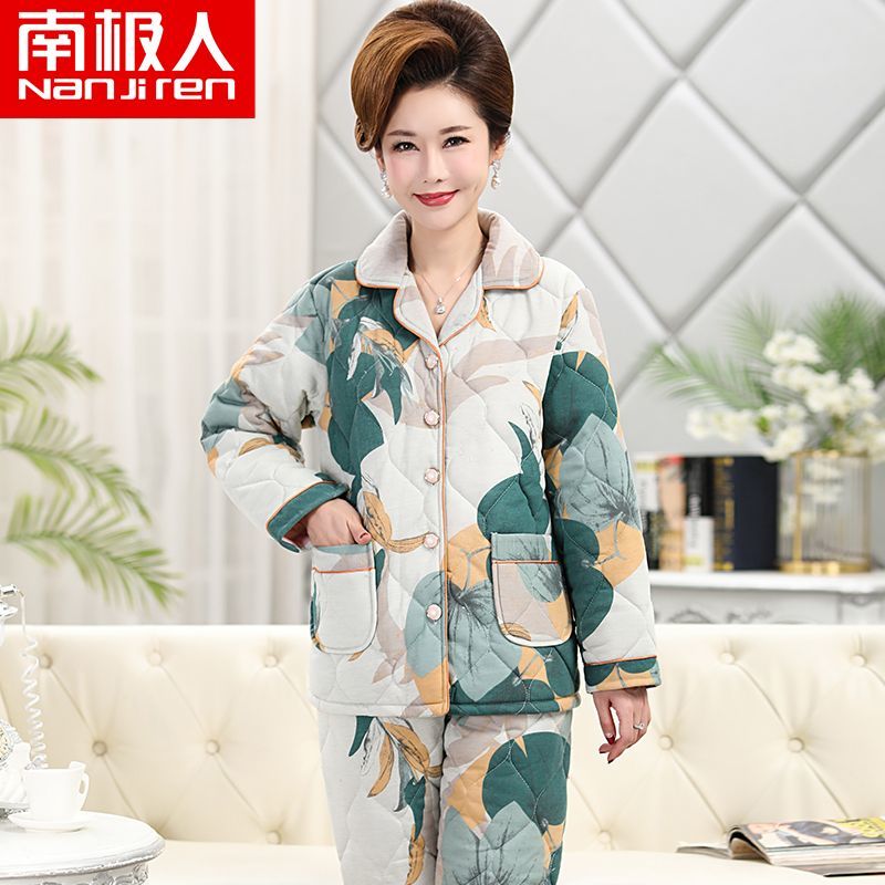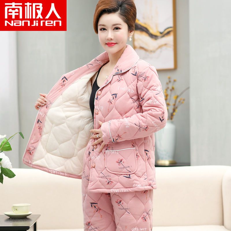 南极人三层夹棉纯棉睡衣女冬加厚大码中老年冬季新疆棉家居服套装
