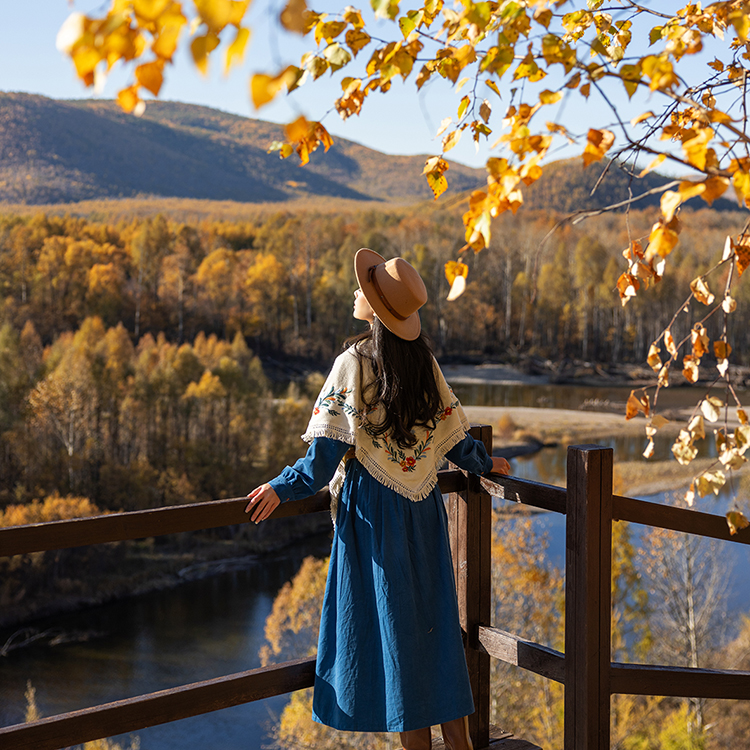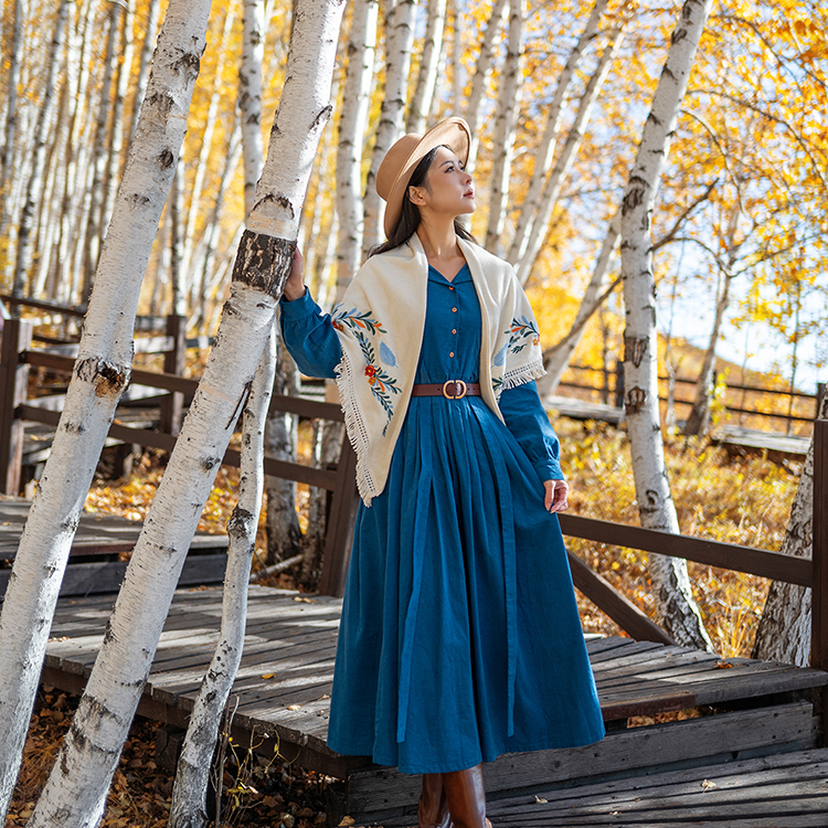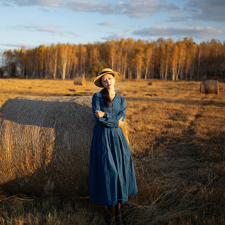理想三旬女装秋装法式复古文艺蓝色灯芯绒大裙摆连衣裙中长裙