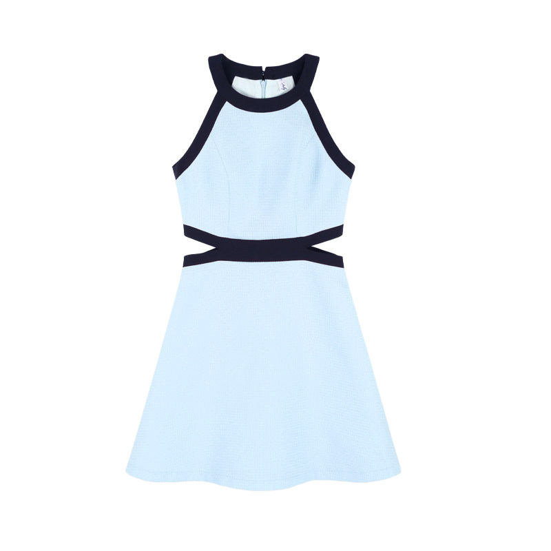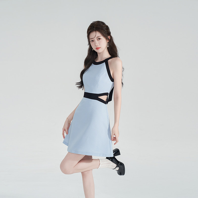 蓝色蝴蝶结挂脖连衣裙女夏季