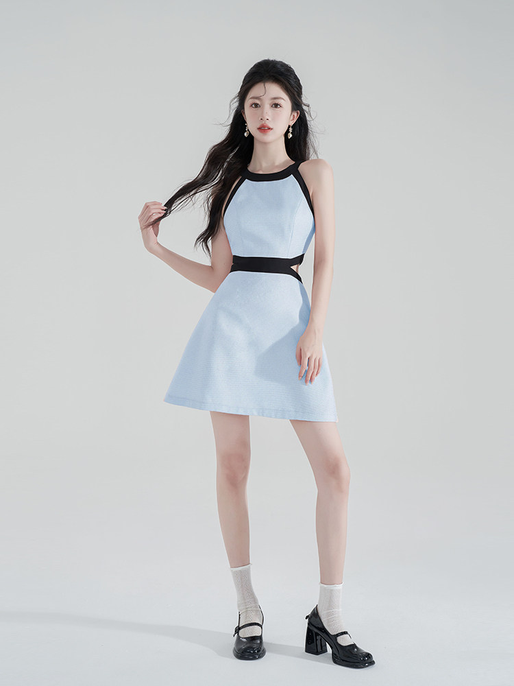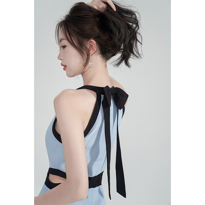 蝴蝶结蓝色挂脖连衣裙女夏季2025新款高级感露腰甜美气质显瘦短裙
