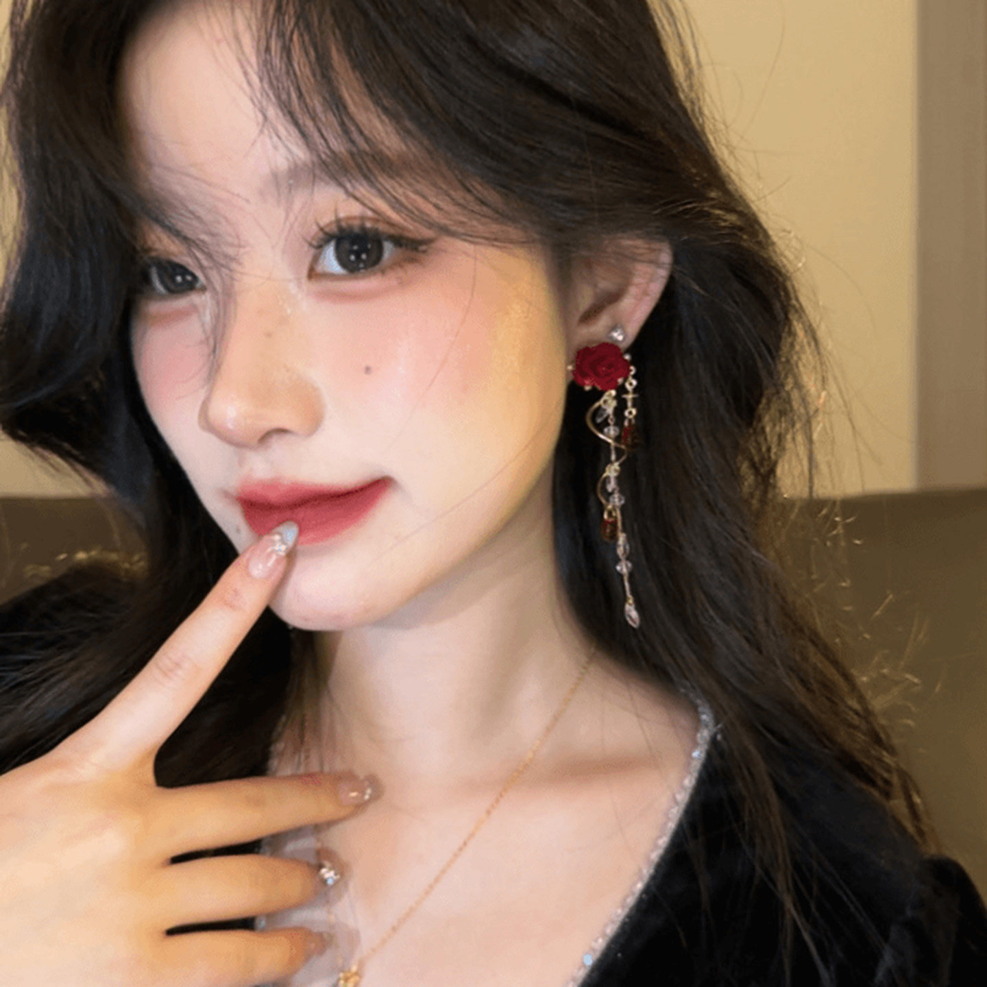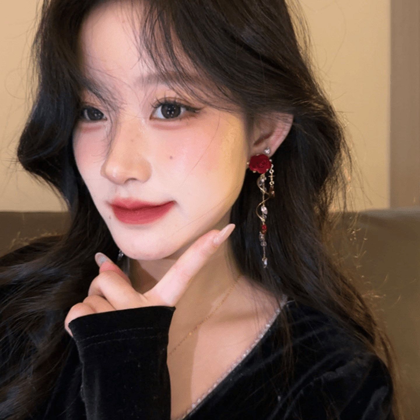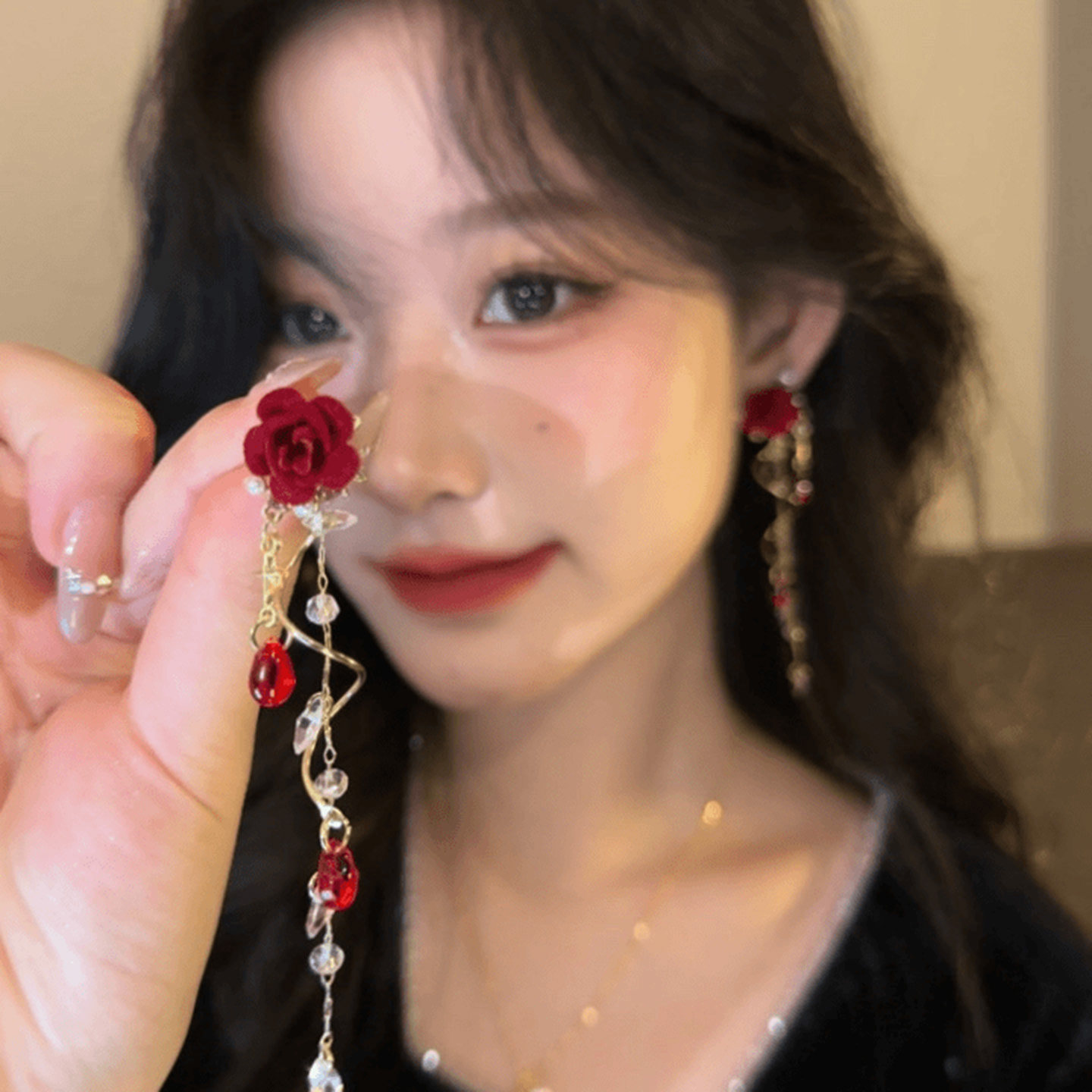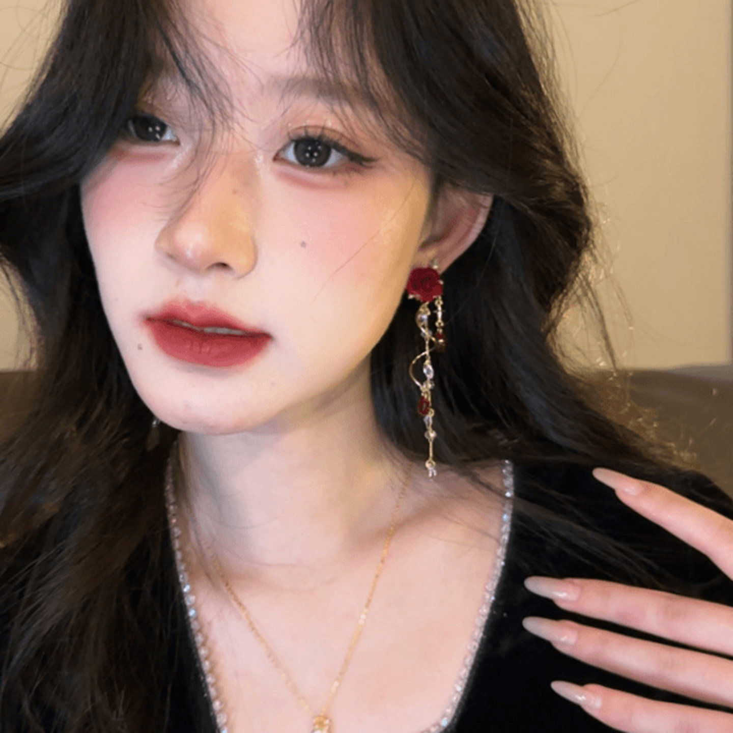 玫瑰恋人~红色闪钻长流苏耳钉女2025新款轻奢气质耳环高级感耳饰
