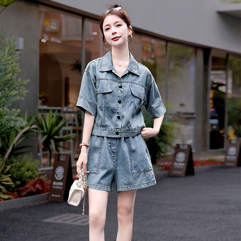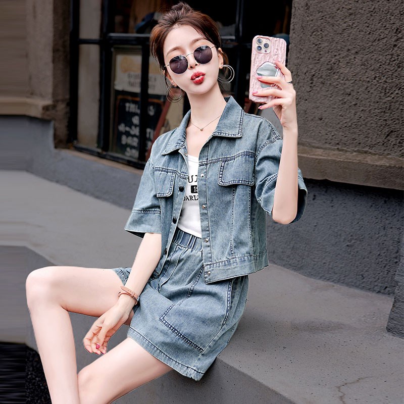 复古牛仔短裤时尚套装女装夏季2024新款夏装两件套时髦洋气小个子