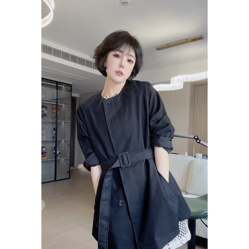 复古风衣女中长款2025年春秋新款韩系单排扣圆领大衣外套