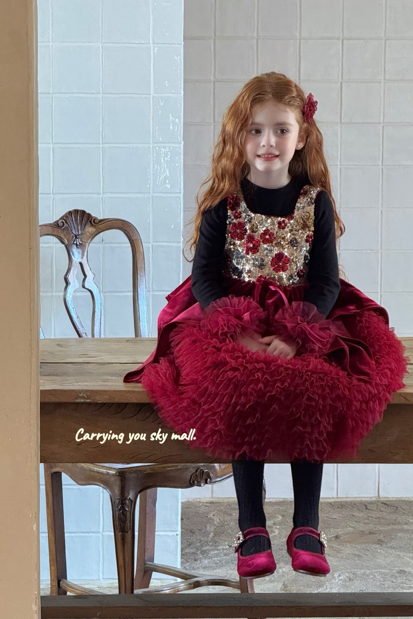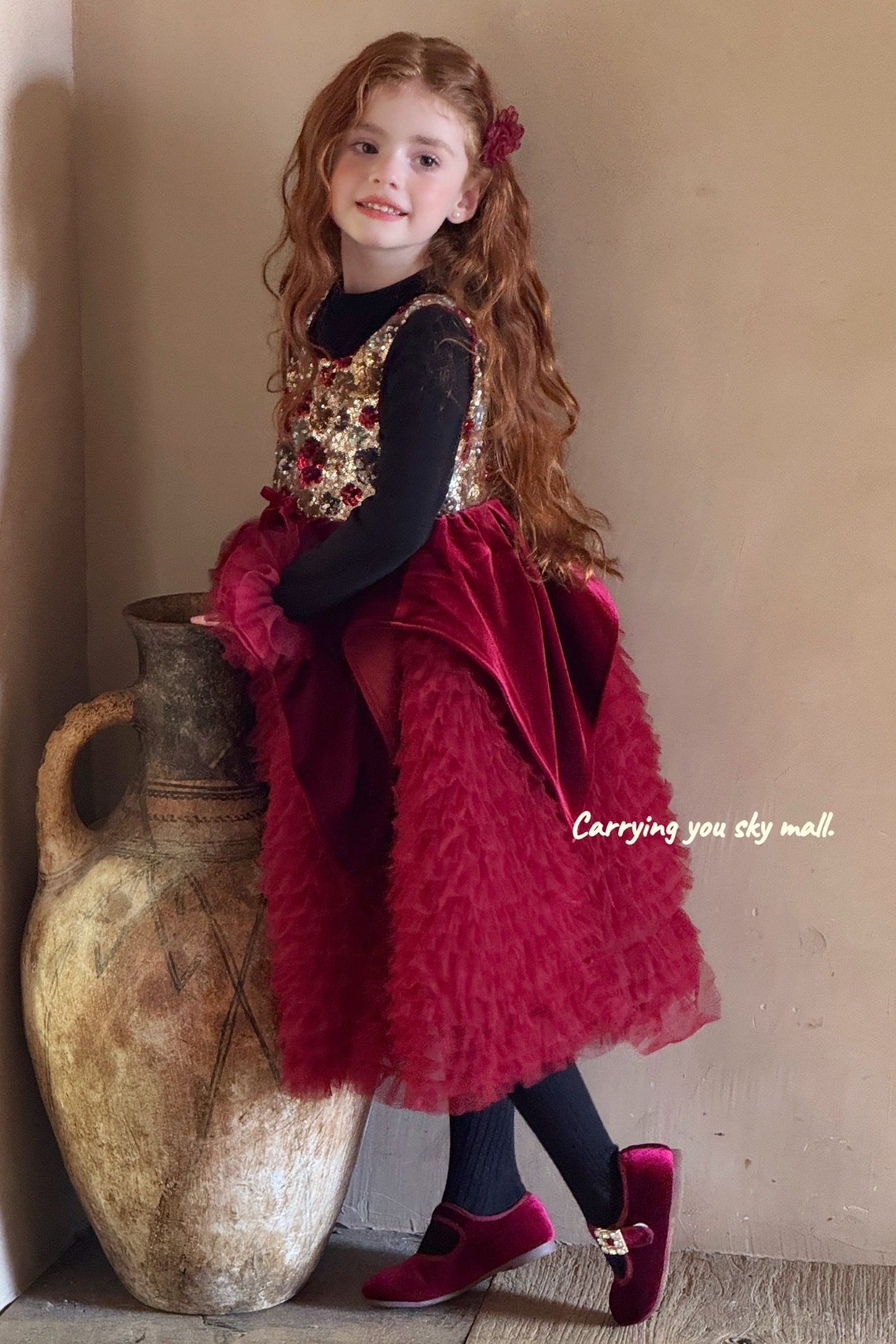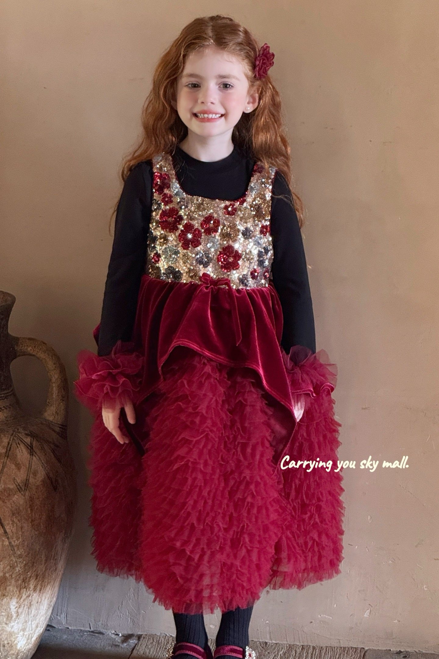 女童红色圣诞生日礼服裙儿童蓬蓬蛋糕裙过新年拜年服迪士尼公主裙