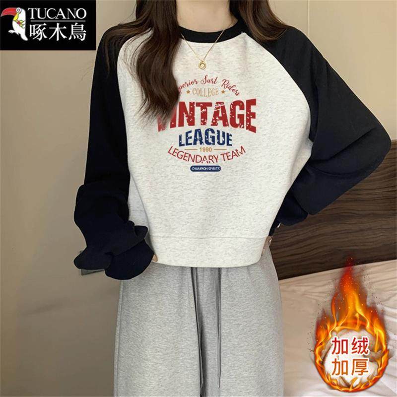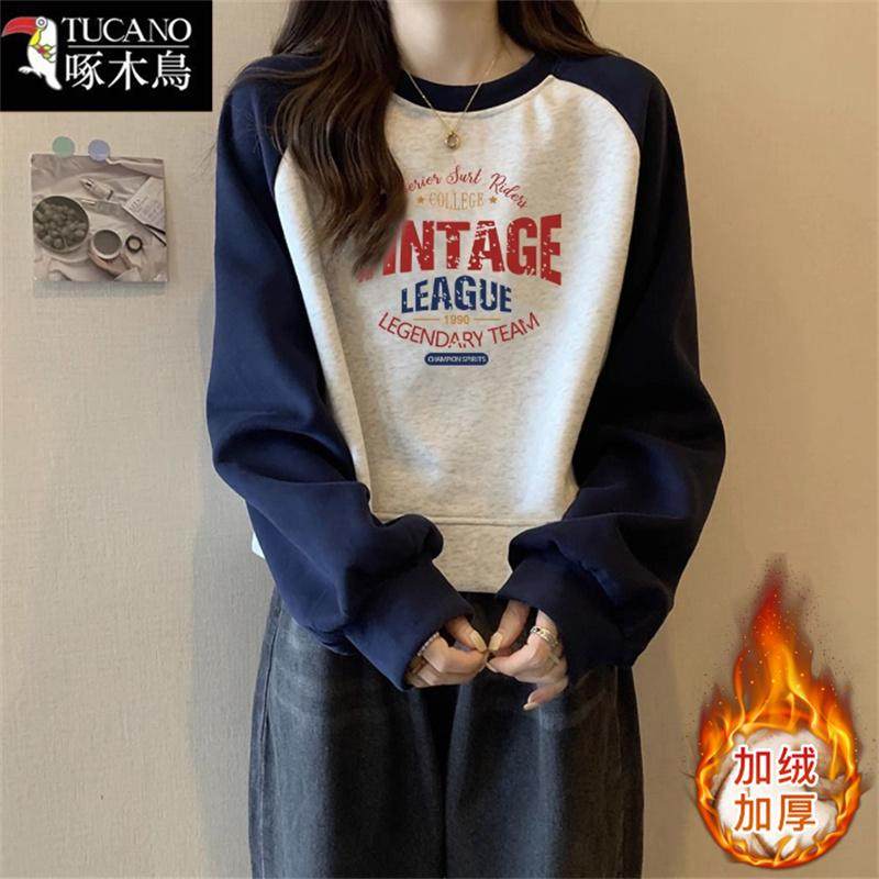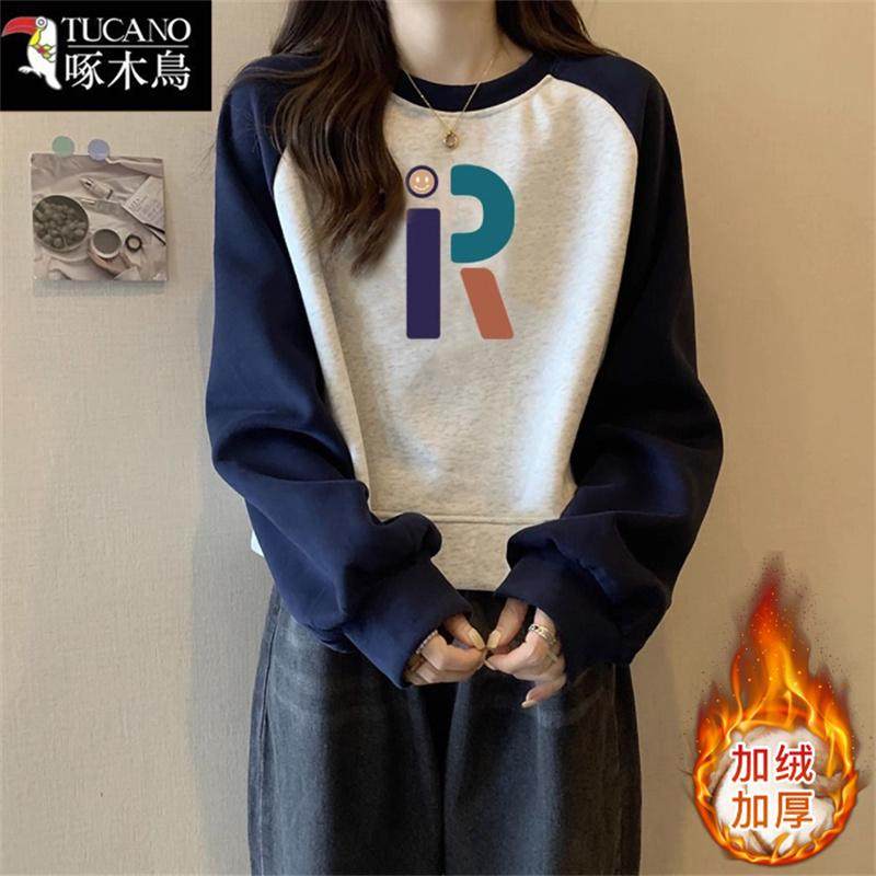 啄木鸟纯棉加绒加厚卫衣女2024秋冬新款休闲宽松长袖百搭减龄上衣