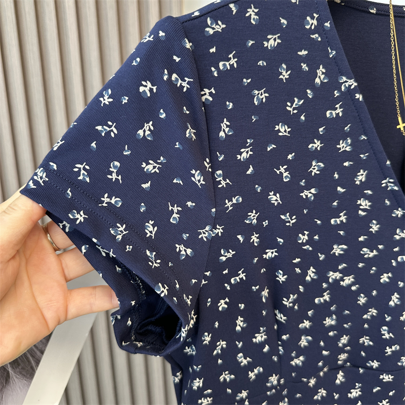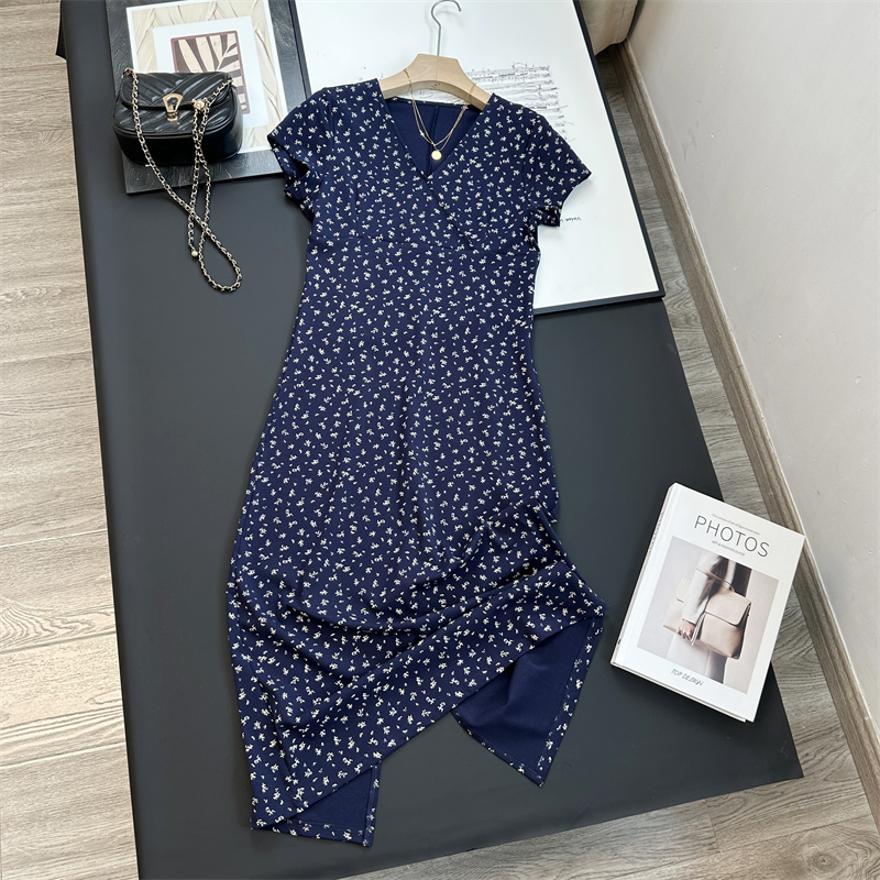 针织棉藏青碎花裙后开叉连衣裙