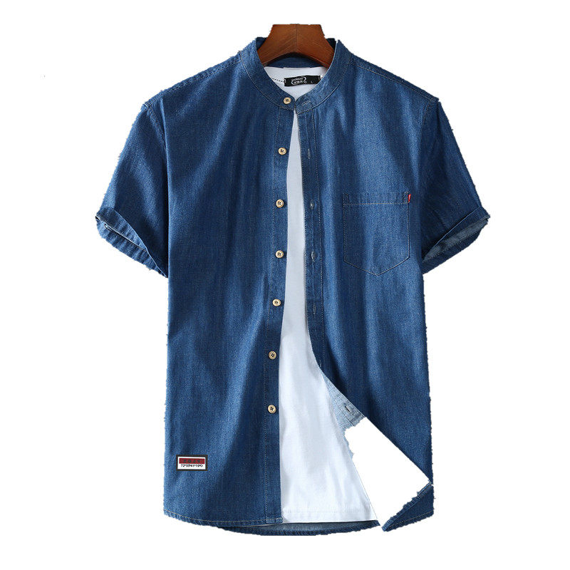 特大码男士短袖牛仔衬衫肥佬大号全棉立领牛仔衣胖子半袖衬衣夏季