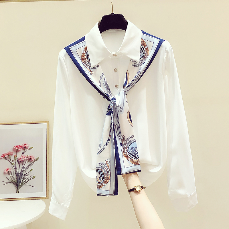 2025春秋新款法式丝巾飘带拼接雪纺长袖衬衫女设计感小众白色上衣