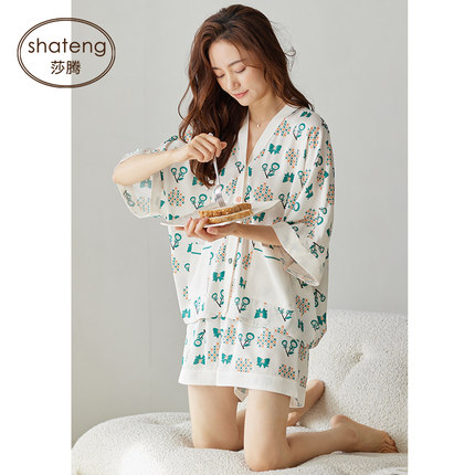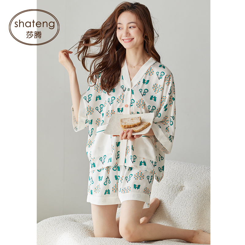 冰丝绸睡衣女夏季薄款短袖短裤开衫大码中袖可外穿家居服两件套装