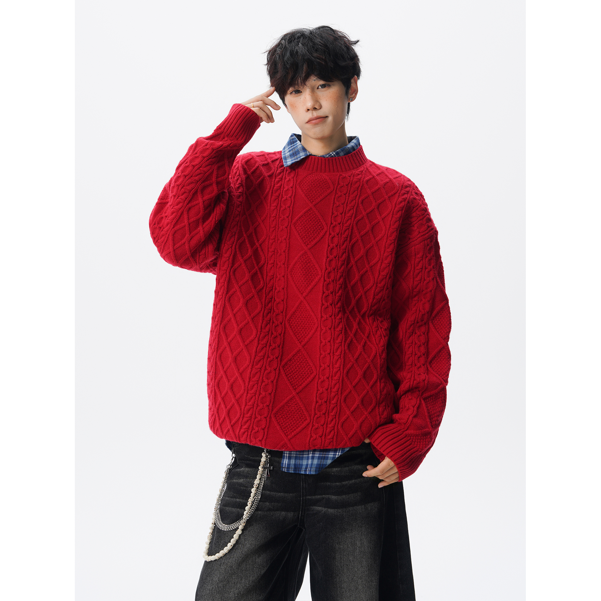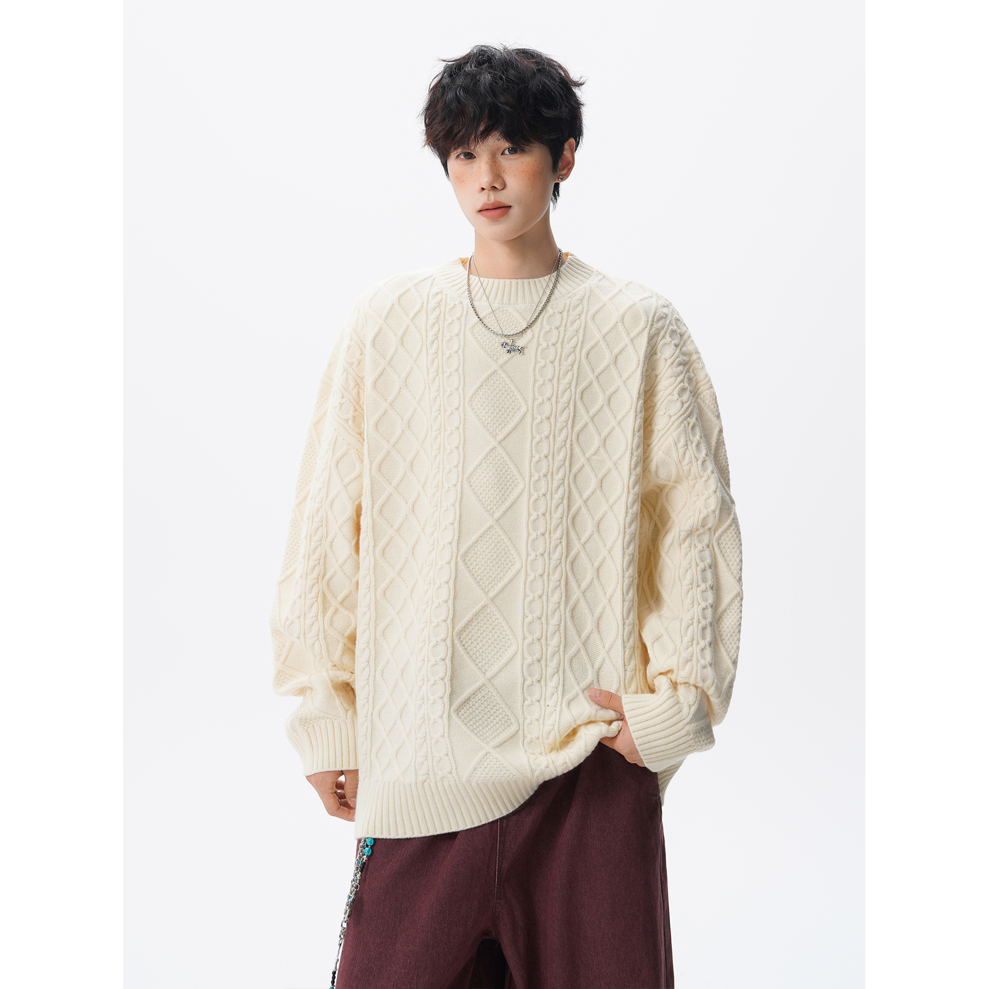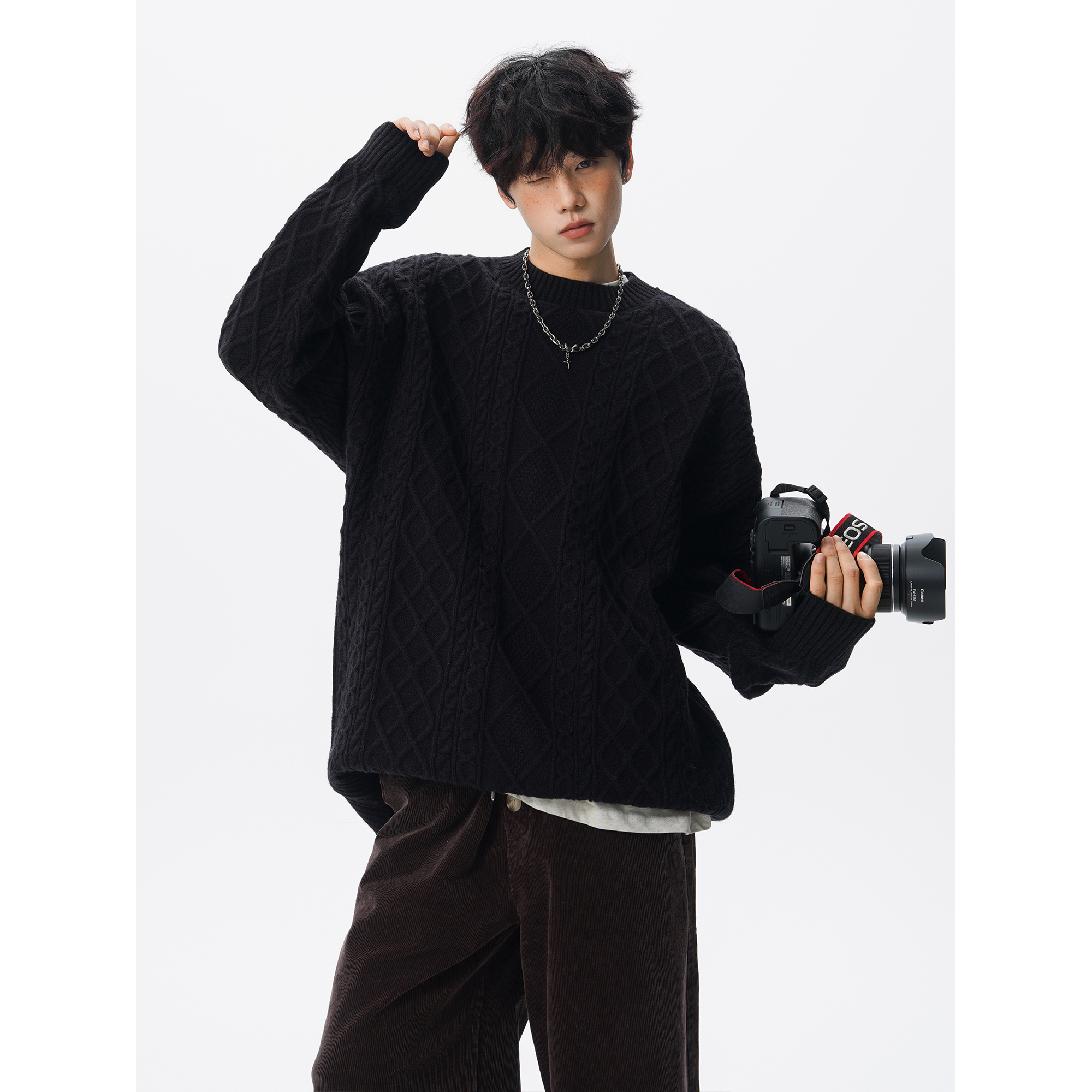 重磅纯色菱格麻花圆领毛衣男生秋冬季美式宽松休闲保暖大码针织衫