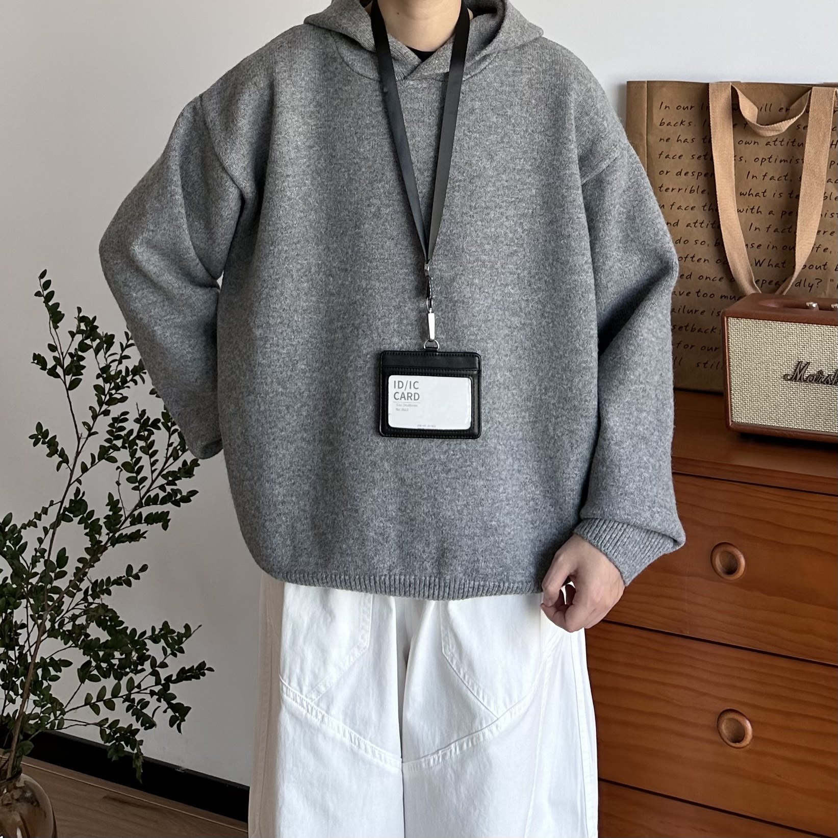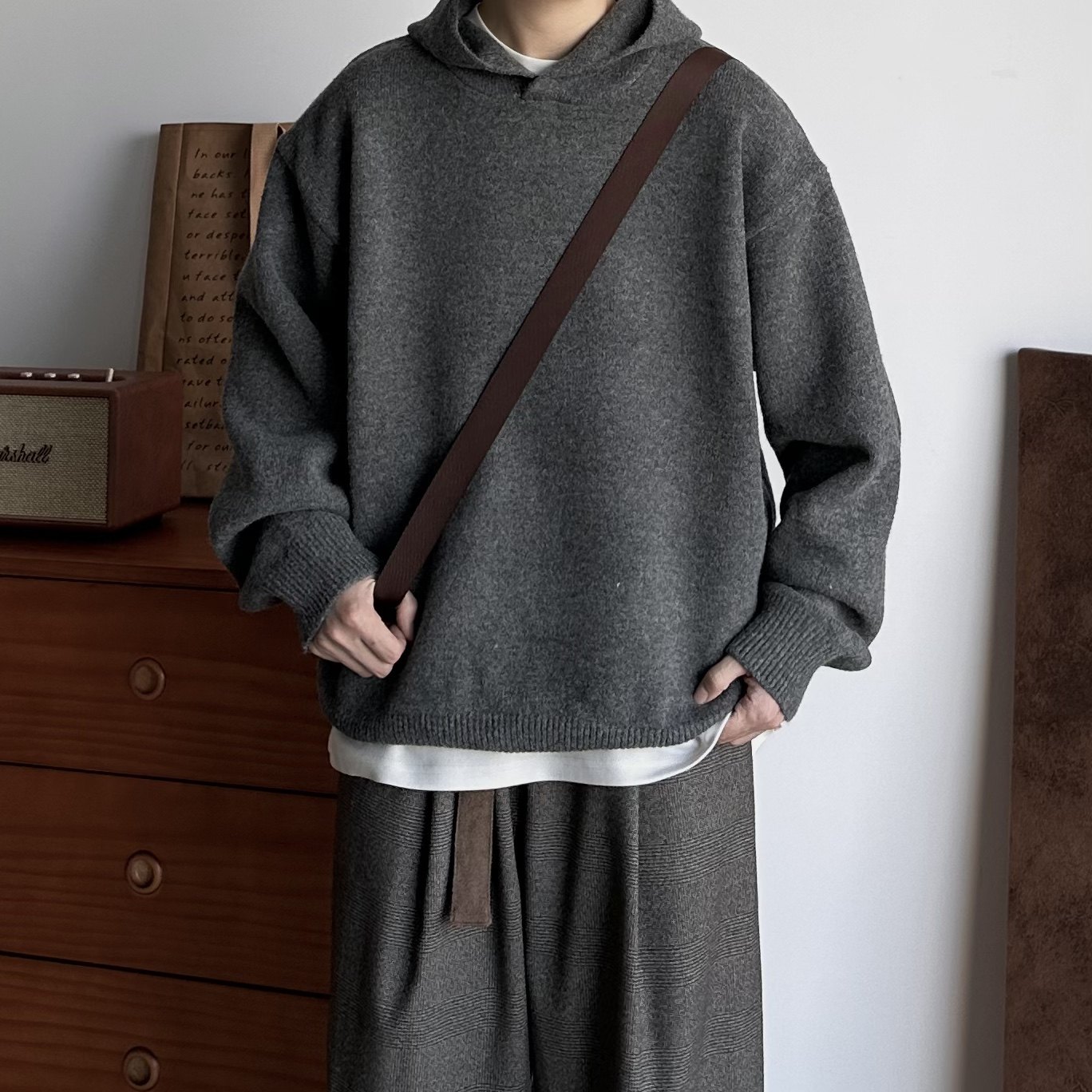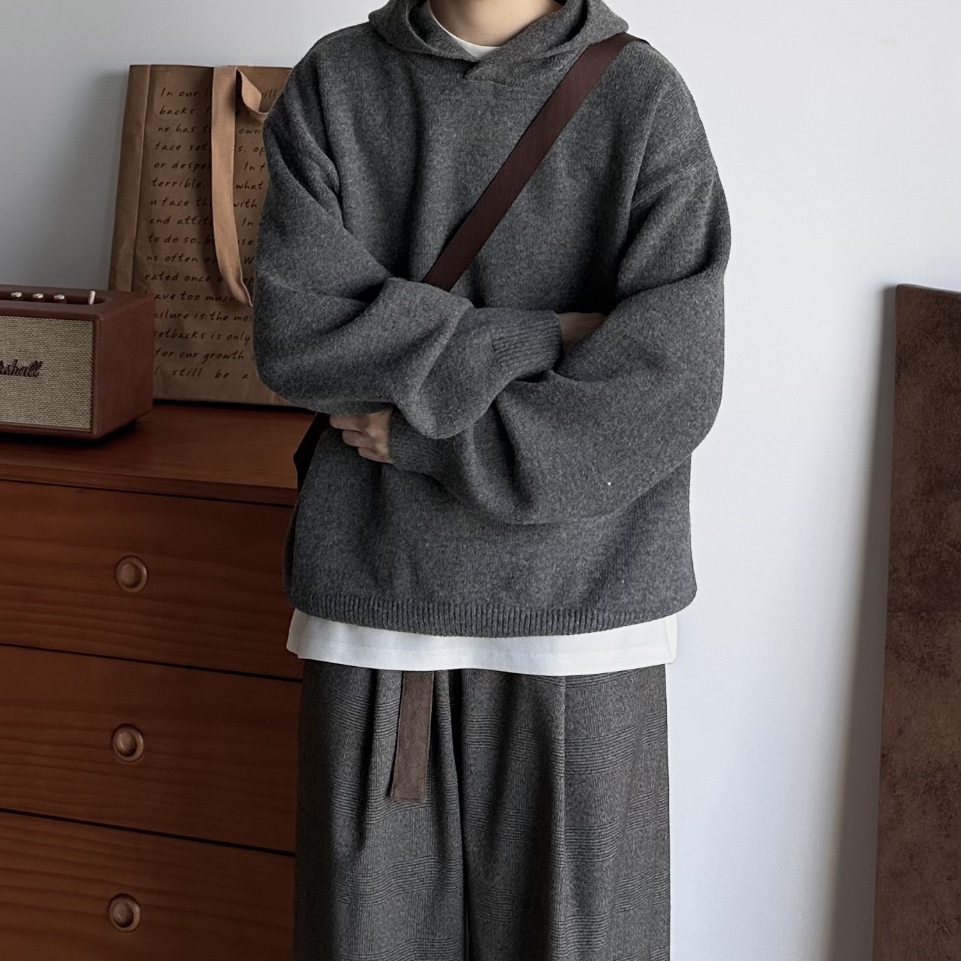 BUTQIU日系复古秋冬宽松连帽针织衫男女氛围感百搭短款毛衣外套