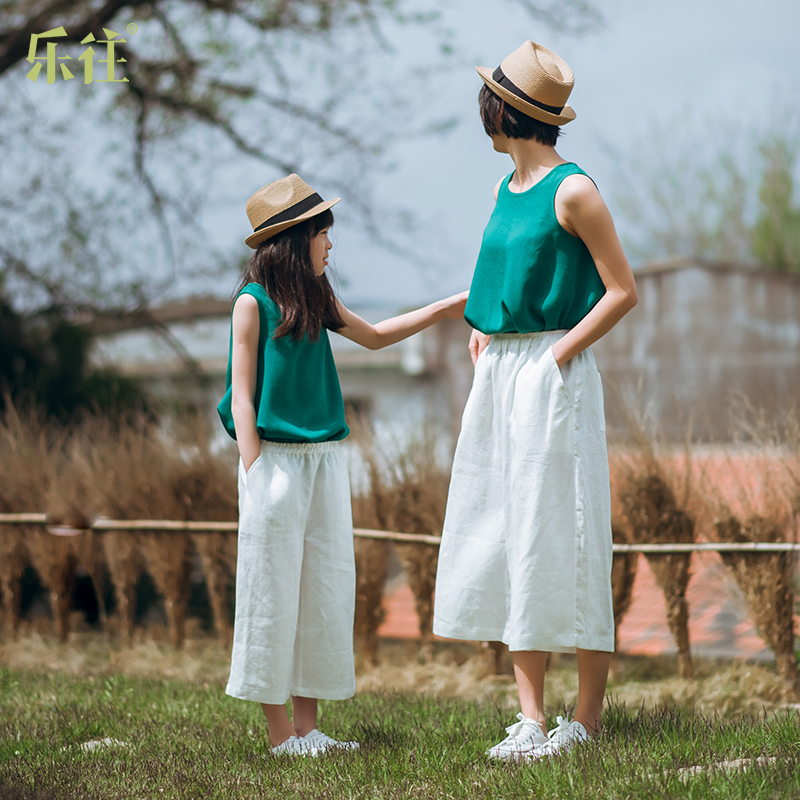 小乐往原创亲子装37夏女童海边拍照白色亚麻度假母女八分阔腿裤